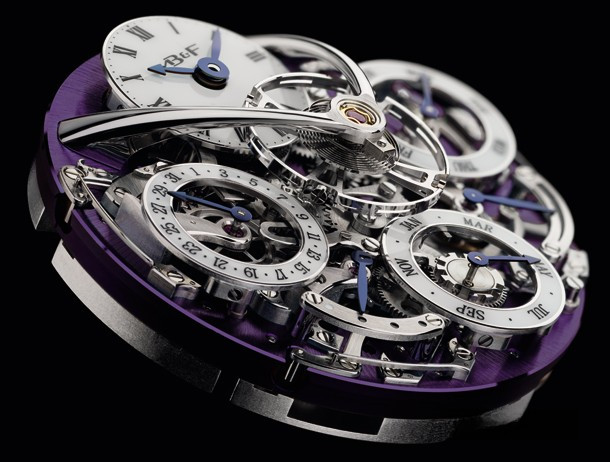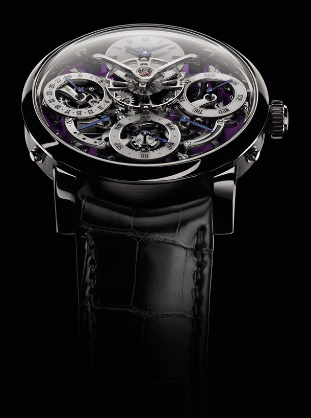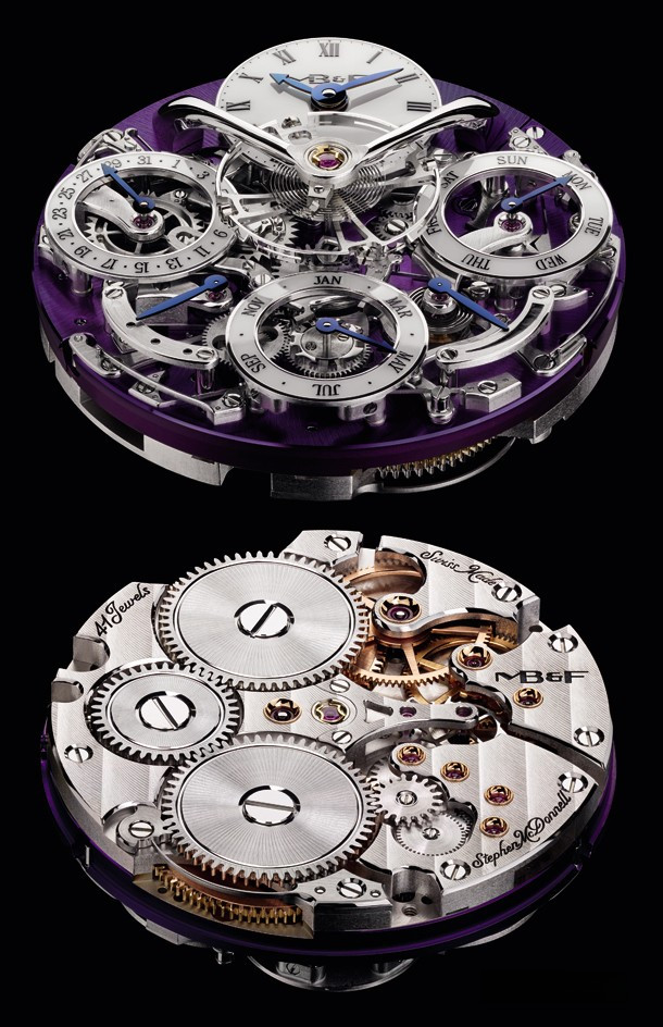 Начав с чистого листа, MB&F и независимый ирландский часовщик Стивен МакДоннел заново изобрели вечный календарь – самое известное часовое усложнение. Результатом этого стали завораживающие часы Legacy Machine Perpetual с механизмом собственного производства. Авторы уникальной модели полностью переосмыслили конструкцию, с тем чтобы избавиться от недостатков, свойственных традиционным вечным календарям. В положении «12 часов», между изысканно изогнутыми арками баланса, находятся часовая и минутная стрелки. Далее по часовой стрелке: индикатор дней недели на отметке «3 часа», индикатор запаса хода («4 часа»), месяца («6 часов»), ретроградный индикатор високосного цикла («7 часов») и указатель даты («9 часов»). Модель Legacy Machine Perpetual выпущена в корпусе из белого золота 18к с фиолетовым циферблатом.