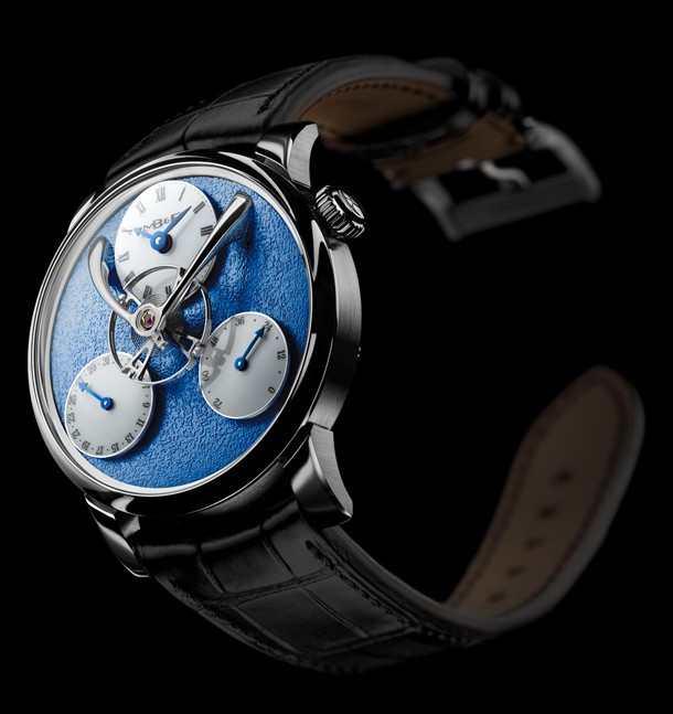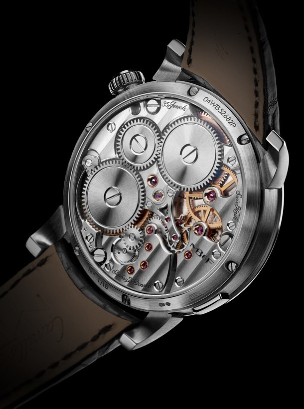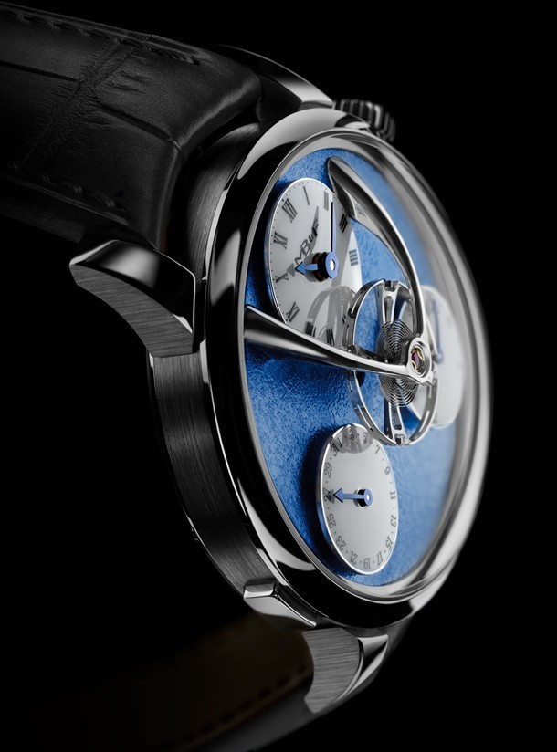 «Split Escapement» – «Раздельный спуск». Располагаясь чуть ниже самой высокой точки выпуклого стекла, баланс совершает колебания с привычной частотой 2,5 Гц (18 000 полуколебаний в час). Однако его конструкция далека от привычной. В отличие от большинства других подвешенных балансов, которые можно встретить в коллекции Legacy Machine, и тем более в отличие от балансов, применяемых в часах любой другой марки, баланс LM Split Escapement выглядит так, словно он колеблется сам по себе, без какого бы то ни было источника энергии. Важнейшие части спуска, дробящие энергию заводной пружины на импульсы – анкерное колесо и анкерная вилка, – вынесены на противоположную сторону часового механизма и расположены почти на 12 мм ниже. Отсюда и название. Под балансом размещены три круглых указателя: время показывает циферблат в положении «12 часов», запас хода – индикатор в положении «4 часа», дату – указатель в положении «8 часов». Индикация даты быстро и удобно настраивается кнопкой на торце корпуса рядом с указателем. Синяя «морозная» отделка циферблата в сочетании с родиевым покрытием механизма являет собой образец элегантной классики. Серия насчитывает 18 экземпляров. Часы поставляются на ремешке из кожи аллигатора.