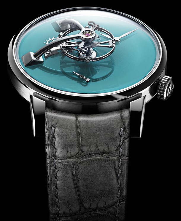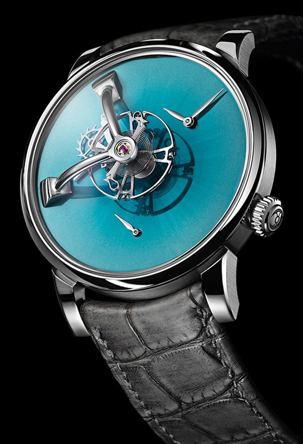 Часы LM101 MB&F H.Moser представлены в корпусе из нержавеющей стали размером 40 х 16 мм водонепроницаемостью 30 метров. Внутри корпуса установлен механизм с ручным заводом, обладающий запасом хода 46 часов. На голубом циферблате отображаются часы, минуты, запас хода. Часы поставляются на ремешке из кожи аллигатора с вставкой из нержавеющей стали. Серия ограничена - 15 шт.