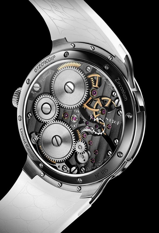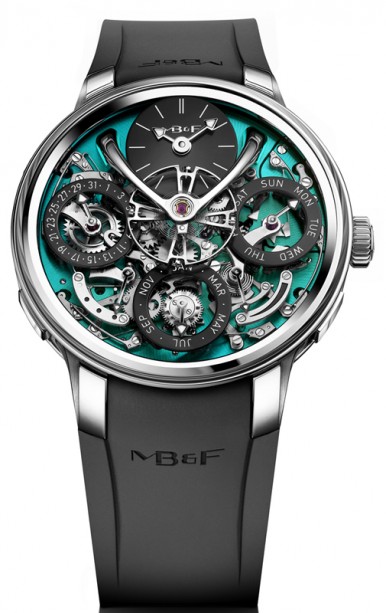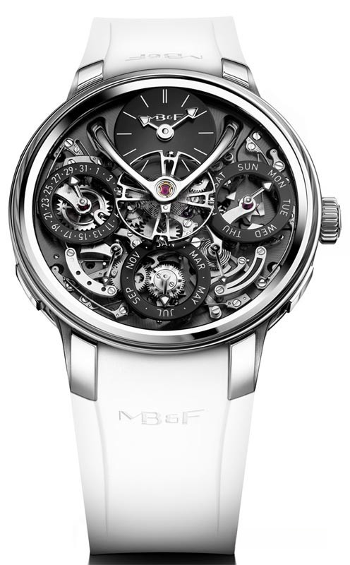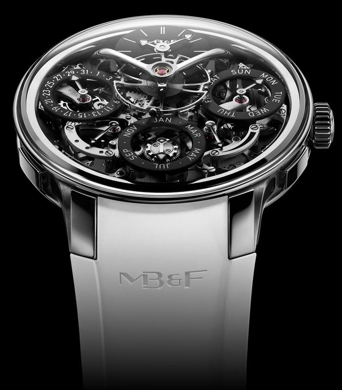 Часы MB&F Legacy Machines Perpetual Evo представлены в корпусе из циркония размером 44 х 17.5 мм водонепроницаемостью 80 метров. Внутри корпуса установлен механизм с ручным заводом, обладающий запасом хода 72 часа. На черном скелетированном циферблате отображаются часы, минуты, дата, день недели, месяц, ретроградный индикатор високосного года, запаса хода. Часы поставляются на каучуковом ремешке с вставкой из титана. Серия ограничена - 15 шт.