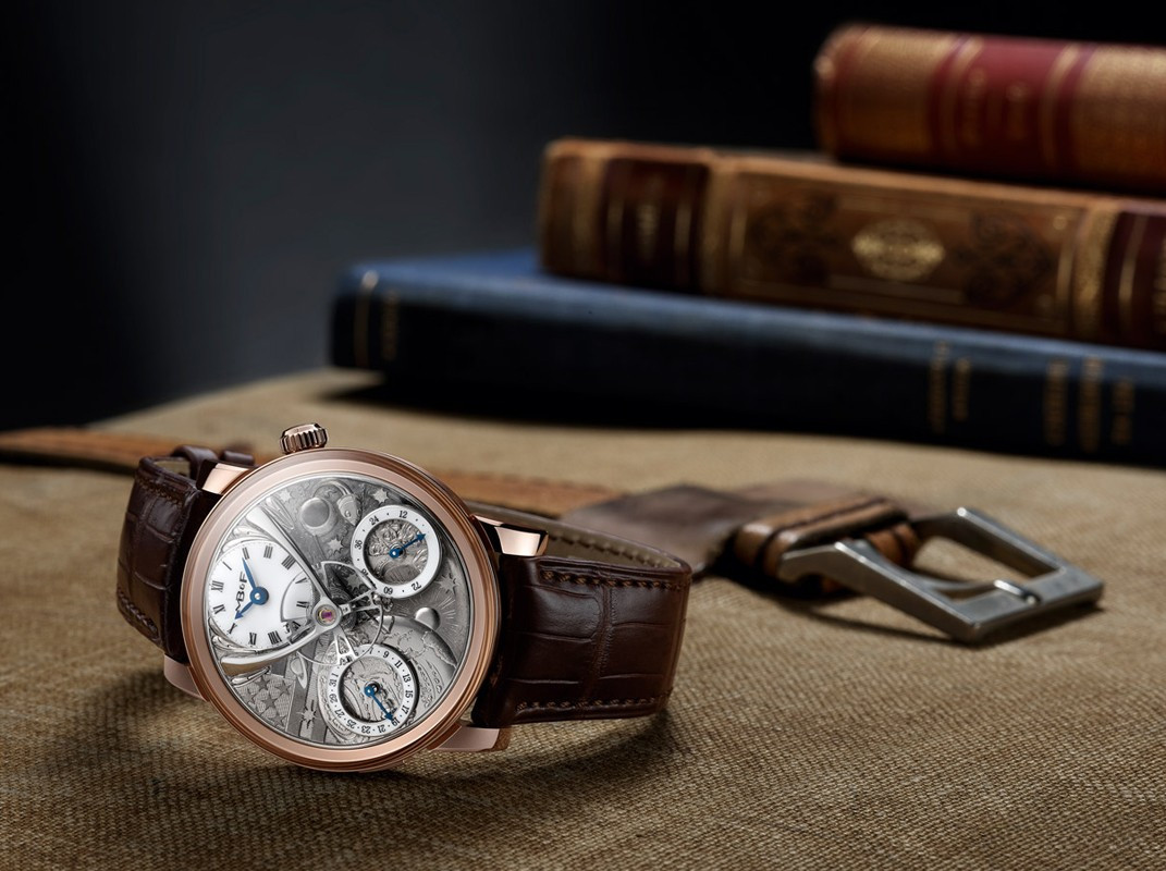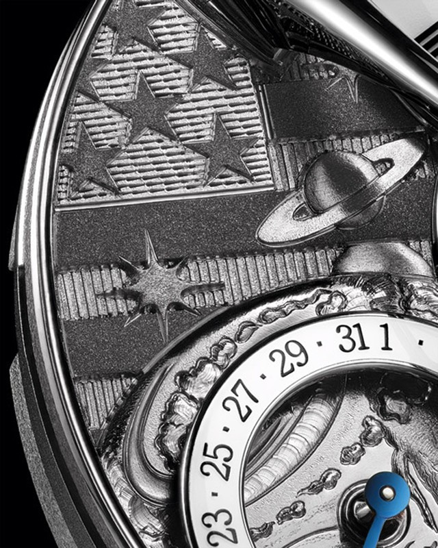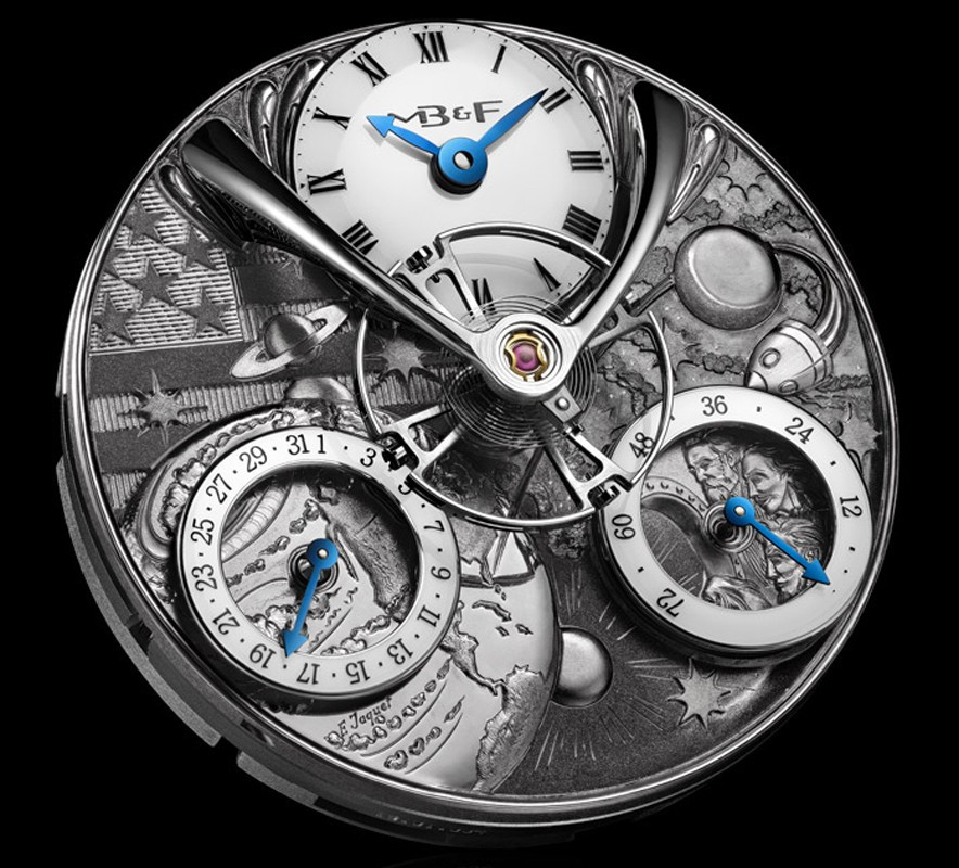 Ограниченная серия в единичном экземпляре с циферблатами с гравировками Эдди Жаке, вдохновленными романами Жюля Верна. Механизм LM SE разработан Стивеном МакДоннелом по заказу MB&F. Сплит-спуск с подвешенным над циферблатом колесом баланса и расположенными под часовым механизмом анкером и анкерным колесом. Ручной завод, два заводных барабана. Запас хода: 72 часа. Изготовленное на заказ балансовое колесо диаметром 14 мм с традиционными винтами регулировки, видимое с лицевой стороны механизма. Великолепная ручная отделка в стиле XIX века: внутренние углы с полированными вручную кромками, узор «Женевские волны», ручная гравировка. Частота баланса: 2,5 Гц /18 000 пк/час. Количество деталей: 296. Количество камней: 35. Функции и индикаторы: часы, минуты, дата и индикация запаса хода. Кнопка рядом с указателем даты для быстрой корректировки даты. Корпус изготовлен из розового золота 18к размером 44.5 х 18.2 мм. Водонепроницаемость 30 метров. Сапфировые стекла с лицевой и обратной стороны корпуса с двусторонним антибликовым покрытием. Прошитый вручную темно-коричневый ремешок из кожи аллигатора, раскладывающаяся застежка из красного золота 18к в тон корпусу.