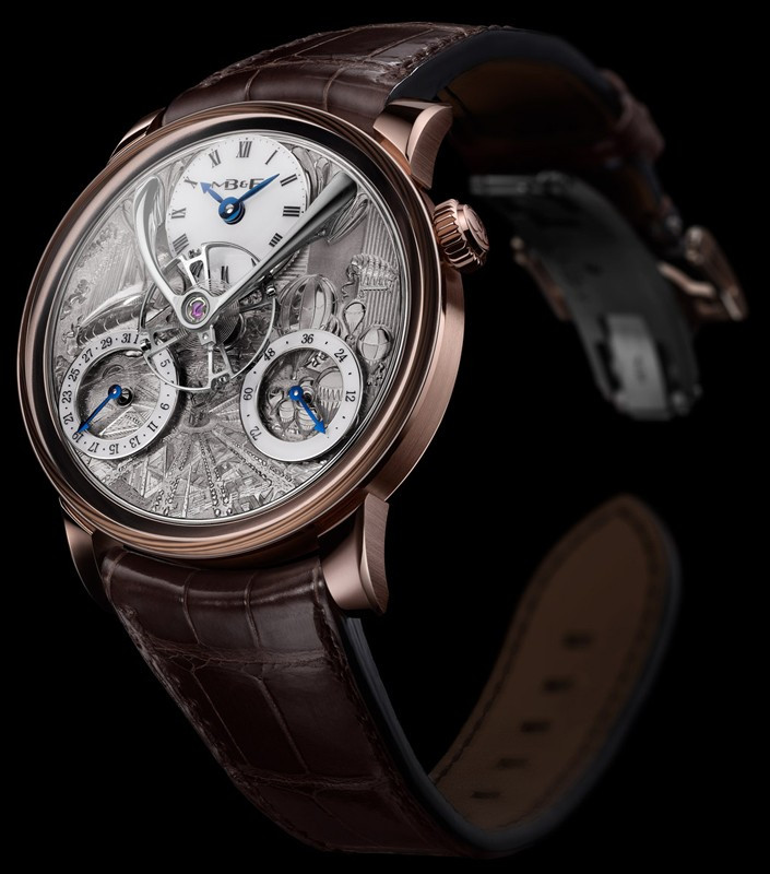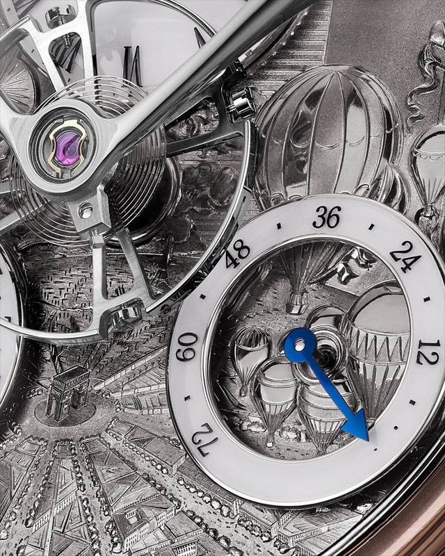 Ограниченная серия в единичном экземпляре с циферблатами с гравировками Эдди Жаке, вдохновленными романами Жюля Верна. Механизм LM SE разработан Стивеном МакДоннелом по заказу MB&F. Сплит-спуск с подвешенным над циферблатом колесом баланса и расположенными под часовым механизмом анкером и анкерным колесом. Ручной завод, два заводных барабана. Запас хода: 72 часа. Изготовленное на заказ балансовое колесо диаметром 14 мм с традиционными винтами регулировки, видимое с лицевой стороны механизма. Великолепная ручная отделка в стиле XIX века: внутренние углы с полированными вручную кромками, узор «Женевские волны», ручная гравировка. Частота баланса: 2,5 Гц /18 000 пк/час. Количество деталей: 296. Количество камней: 35. Функции и индикаторы: часы, минуты, дата и индикация запаса хода. Кнопка рядом с указателем даты для быстрой корректировки даты. Корпус изготовлен из розового золота 18к размером 44.5 х 18.2 мм. Водонепроницаемость 30 метров. Сапфировые стекла с лицевой и обратной стороны корпуса с двусторонним антибликовым покрытием. Прошитый вручную темно-коричневый ремешок из кожи аллигатора, раскладывающаяся застежка из красного золота 18к в тон корпусу.