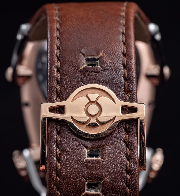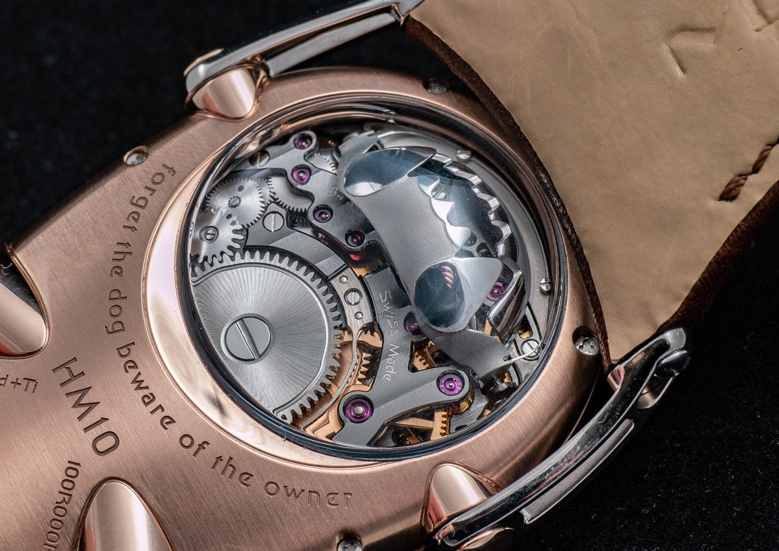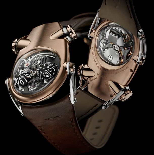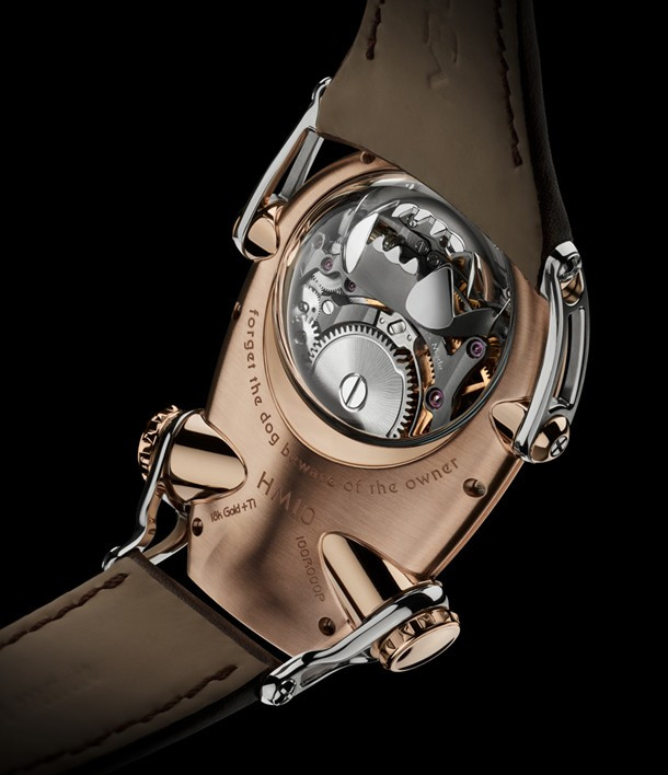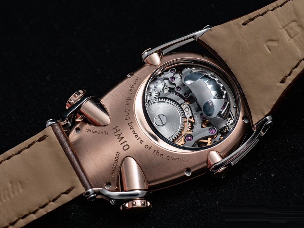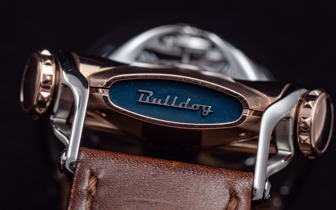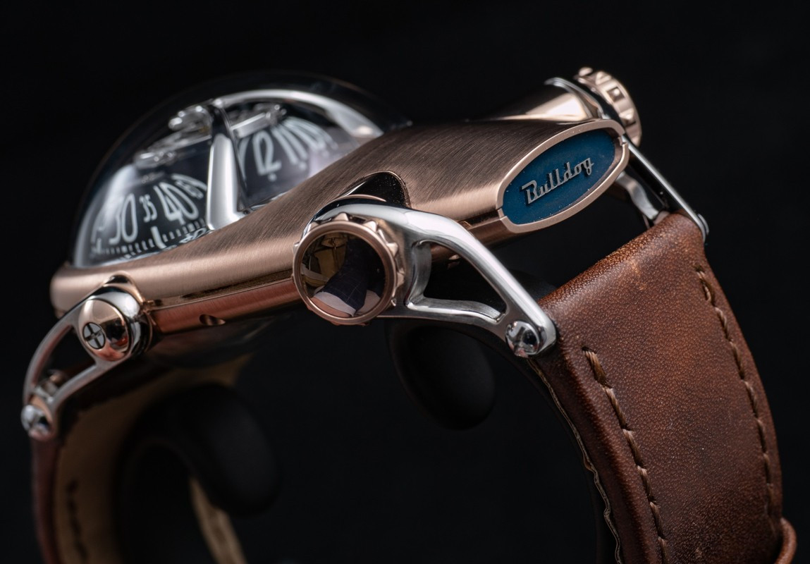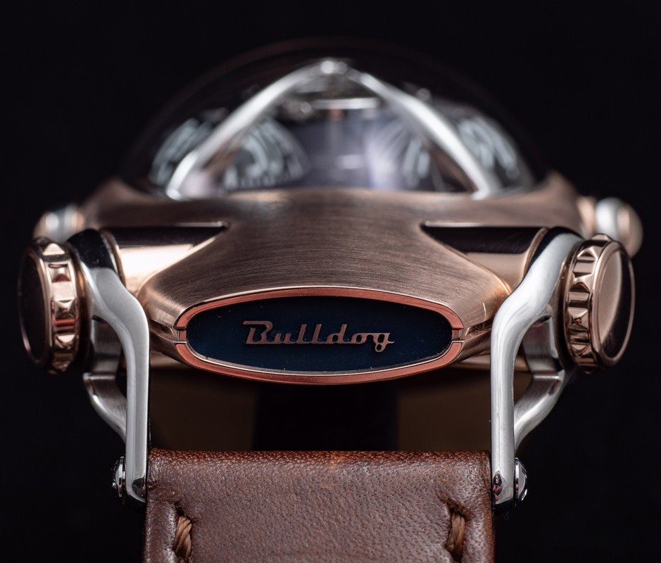 Часы Horological Machine N°10 Bulldog имеют компактный округлый корпус из титана и розового золота 18к в сочетании со сферическим сапфировым стеклом. Два выразительных «глаза» в виде алюминиевых индикаторов времени. Рельефная заводная коронка, напоминающая ошейник с шипами, служит для завода часов и установки времени. Гибкие и при этом прочные «лапы» надежно фиксируют часы на запястье. Механизм с ручным заводом обладает балансовой частотой 2,5 Гц (18 000 пк/ч) и запасом хода 45 часов. На черном циферблате отображаются часы и минуты. Размер корпуса составляет 45 х 54 х 24 мм. Водонепроницаемость 50 метров. На корпусе модели Horological Machine N°10 Bulldog выгравирован совет, схожий с предостережением на ошейниках грозных собак. Ведь собака может вызывать опасение, однако она служит человеку. Поэтому не стоит забывать следующее: «Забудьте про собаку – остерегайтесь ее владельца». Часы поставляются на кожаном ремешке с титановой вставкой.