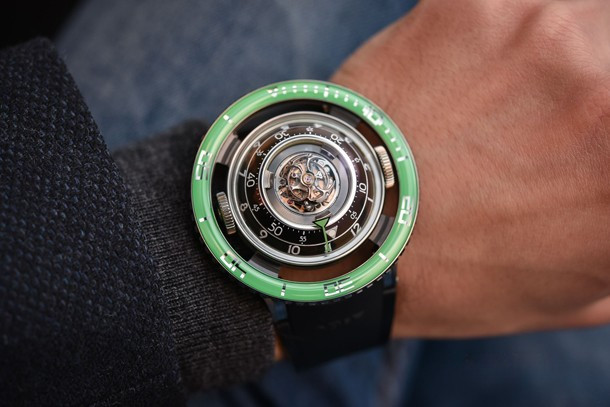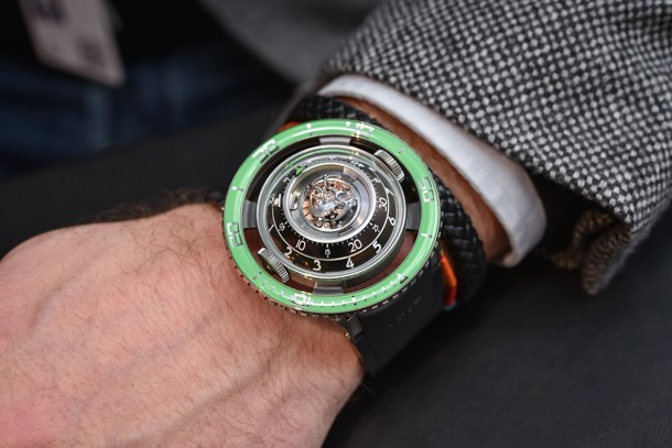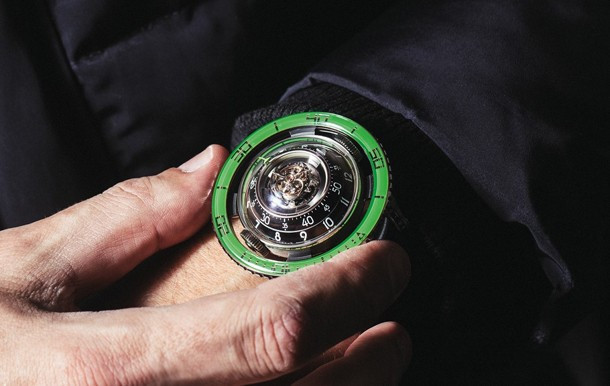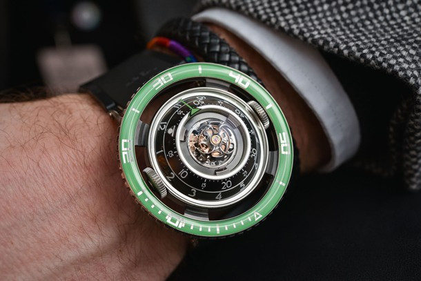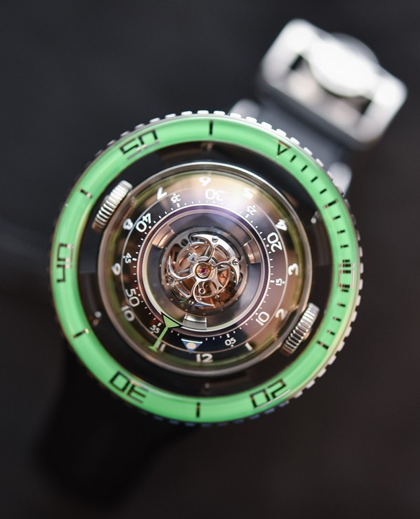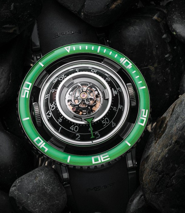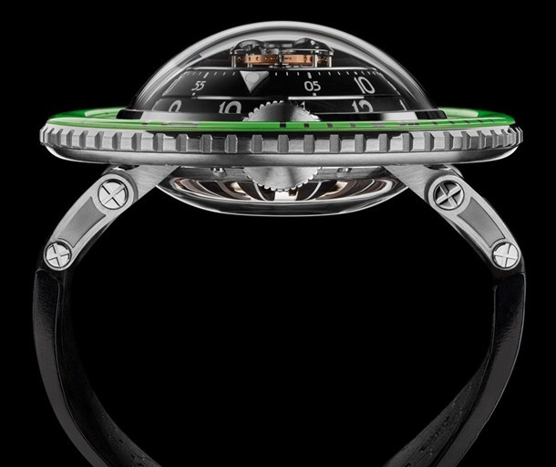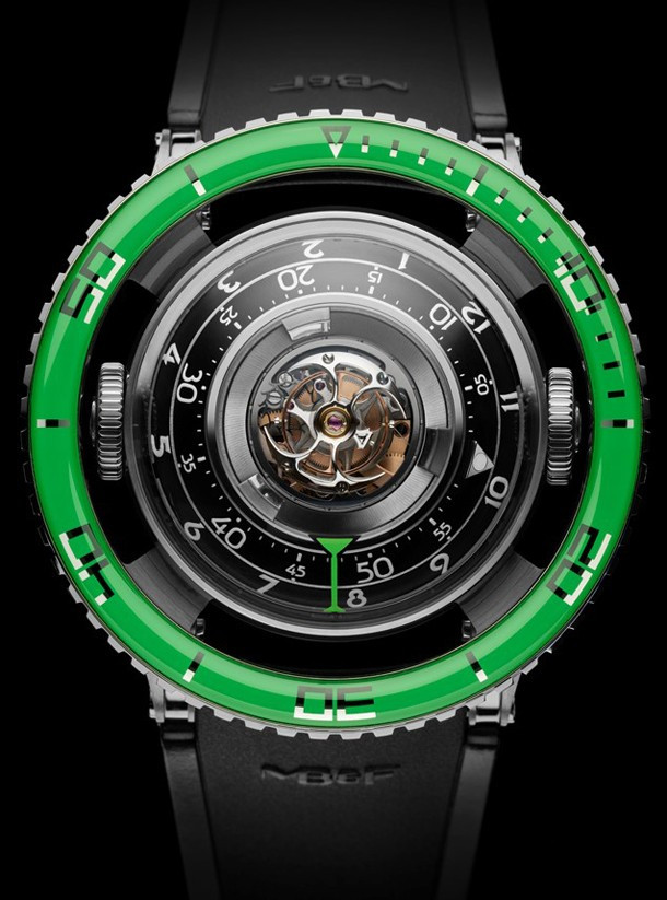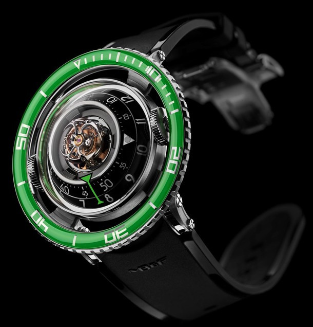 Лимитированная серия (50 шт.) из титана с зеленым безелем. Механизм - трехмерная вертикальная архитектура, автоподзавод, разработка и производство MB&F. Центральный парящий 60-секундный турбийон. Запас хода: 72 часа. Часы и минуты отображаются при помощи двух сферических дисков из алюминия и титана, вращающихся на керамических подшипниках увеличенного размера. Вращающийся в одном направлении безель для измерения истекшего времени. Цифры, метки и сегменты по краям ротора из материала Super-LumiNova. Две заводные коронки: левая для завода, правая для установки времени. Корпус размером 53,8 мм x 21,3 мм, водонепроницаемость 50 метров. Верхнее и нижнее сапфировые стекла имеют двустороннее антибликовое покрытие. Каучуковый браслет из упругого фтороуглерода FKM 70 Shore A с раскладывающейся застежкой из титана.