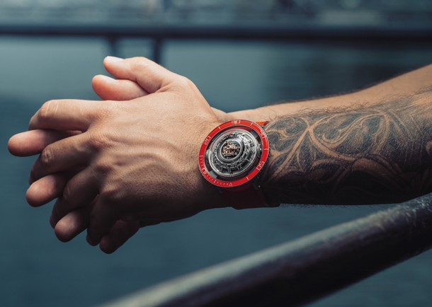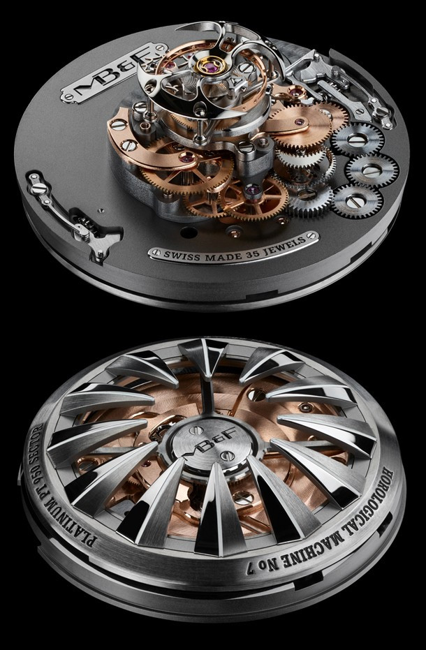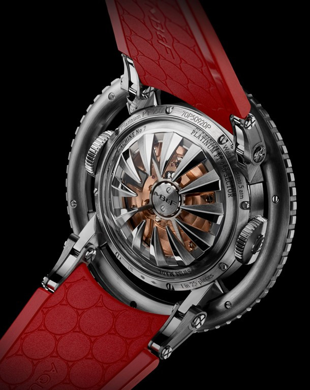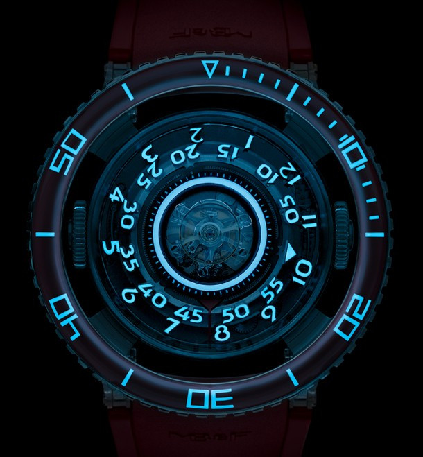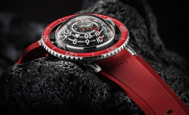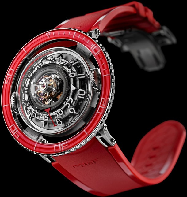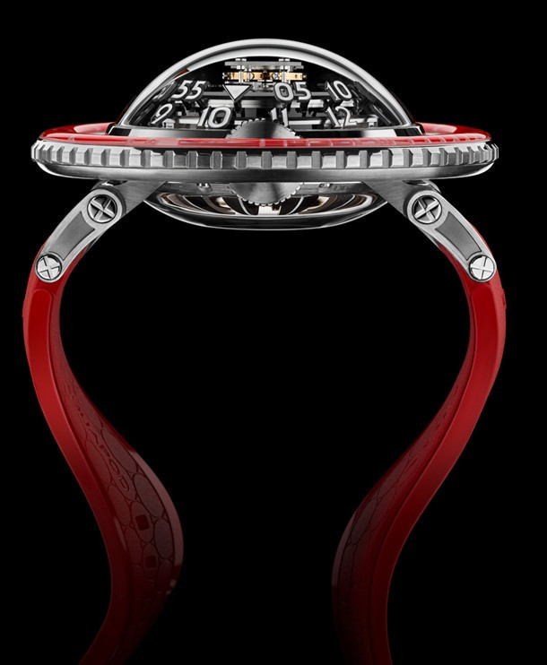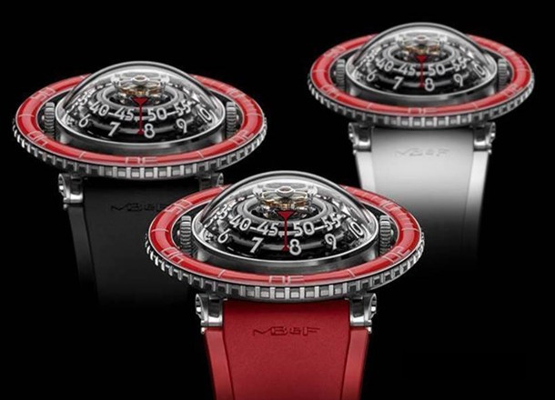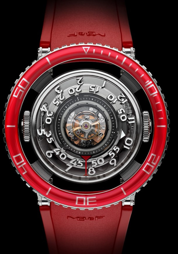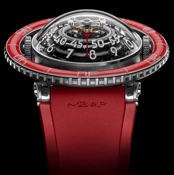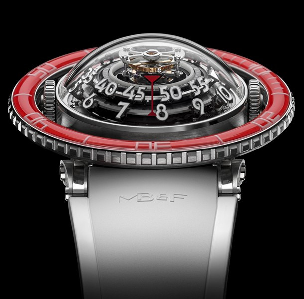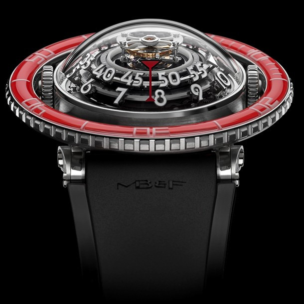 Лимитированная серия (25 шт.) из платины 950 с красным безелем. Механизм - трехмерная вертикальная архитектура, автоподзавод, разработка и производство MB&F. Центральный парящий 60-секундный турбийон. Запас хода: 72 часа. Часы и минуты отображаются при помощи двух сферических дисков из алюминия и титана, вращающихся на керамических подшипниках увеличенного размера. Вращающийся в одном направлении безель для измерения истекшего времени. Цифры, метки и сегменты по краям ротора из материала Super-LumiNova. Две заводные коронки: левая для завода, правая для установки времени. Корпус размером 53,8 мм x 21,3 мм, водонепроницаемость 50 метров. Верхнее и нижнее сапфировые стекла имеют двустороннее антибликовое покрытие. Каучуковый браслет из упругого фтороуглерода FKM 70 Shore A с раскладывающейся застежкой из платины 950.