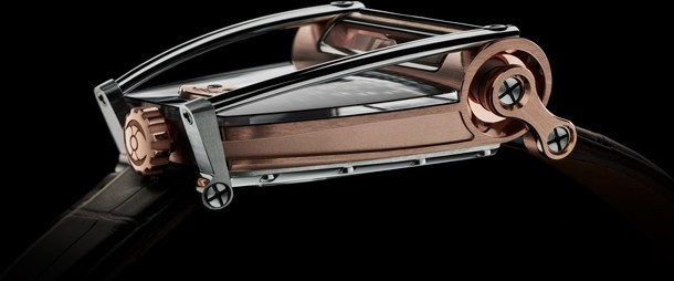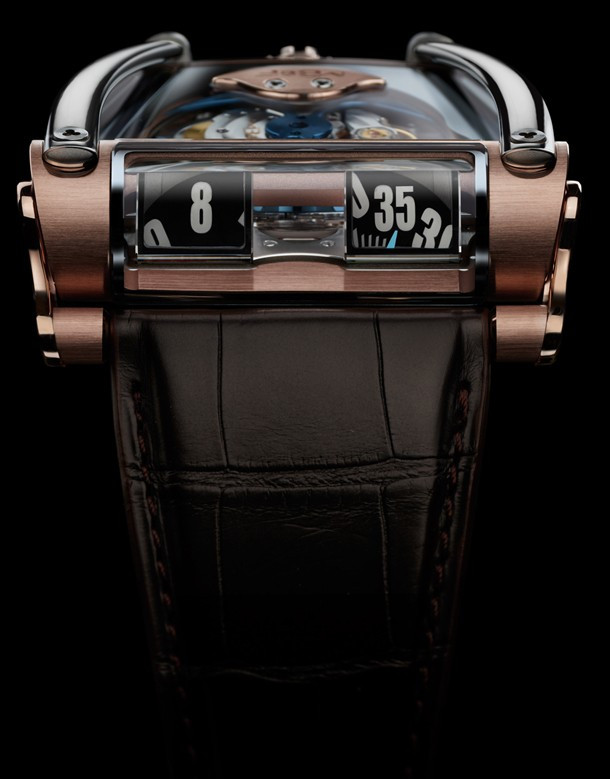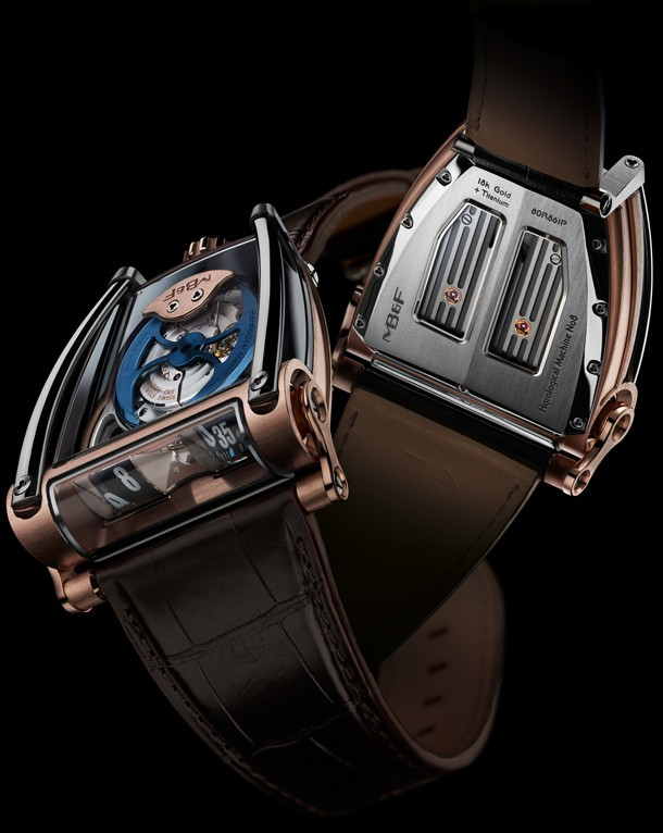 Часы HM8 напоминают о накале страстей и запахе гари на трассах Can-Am – самой скоростной и высокотехнологичной гонки своей эпохи, которой в этом году исполнилось бы 50 лет.«Двигатель» HM8 хорошо просматривается под «капотом» из почти незаметного сапфирового стекла. Ажурная структура ротора в форме боевого топора из вороненого золота открывает взгляду круговую волнообразную отделку механизма. Часовой и минутный диски размещены по углам. Широкое сапфировое стекло не только позволяет увидеть механизм целиком, но и пропускает больше света на диски индикации, упрощая чтение показаний в дневное время. Кроме того, цифры с покрытием Super-LumiNova получают достаточно световой энергии, что гарантирует великолепную читаемость показаний и в темное время суток. Таким образом, дизайн не просто идеально соответствует функциям HM8, но и улучшает их.В модели HM8 Can-Am установлен модуль двунаправленной прыгающей индикации часов и плавной индикации минут, разработанный собственными силами на основе механизма Girard-Perregaux. Его запас хода составляет 42 часа.