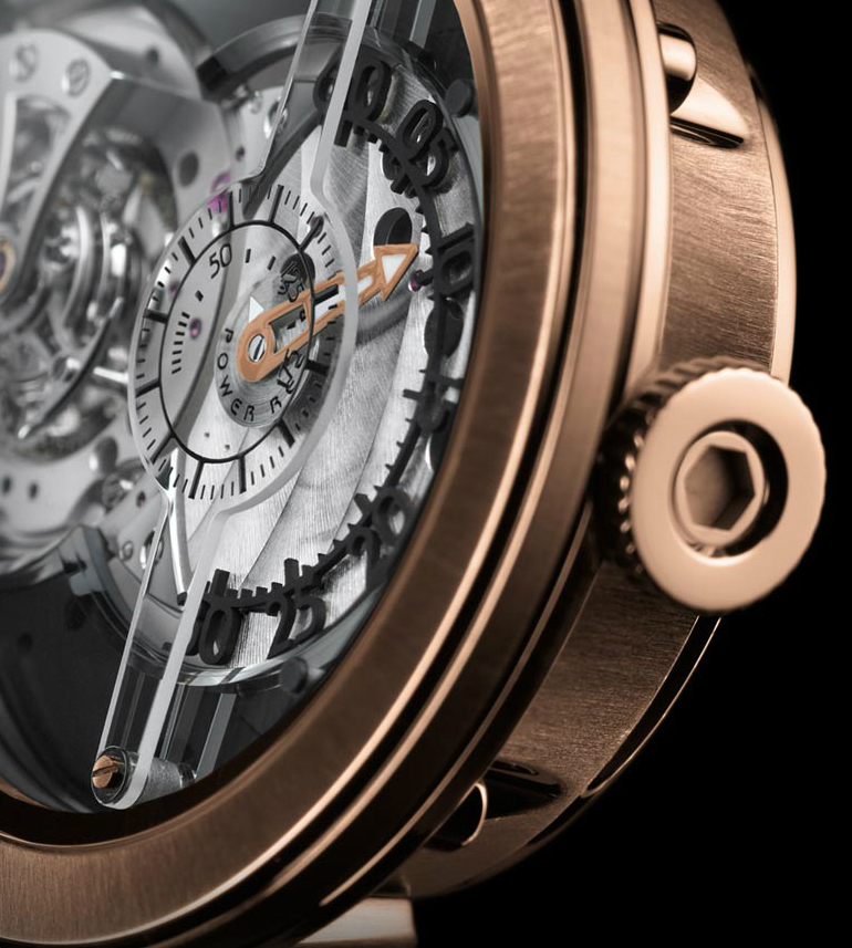 Часы MB&F Horological Machine No.1 представлены в корпусе из розового золота 18к размером 64 x 14 x 49 мм. Внутри корпуса установлен автоматический механизм. На серебристом циферблате отображаются часы, минуты, секунды, запас хода. Часы поставляются на ремешке из кожи аллигатора с вставкой из розового золота 18к. Водонепроницаемость корпуса составляет 30 метров. Серия ограничена - 10 шт.