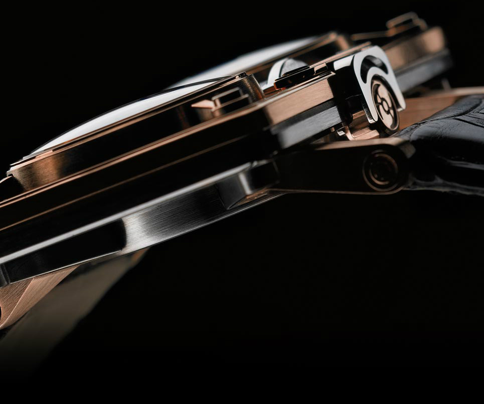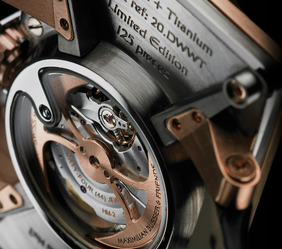 Часы MB&F Horological Machine No.2 представлены в корпусе из титана и розового золота 18к размером 59 x 13 x 38 мм. Внутри корпуса установлен автоматический механизм. На золотистом циферблате отображаются часы, минуты, дата, фаза луны. Часы поставляются на ремешке из кожи аллигатора с вставкой из титана. Водонепроницаемость корпуса составляет 30 метров. Серия ограничена - 125 шт.