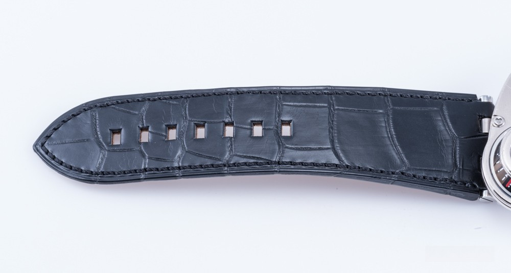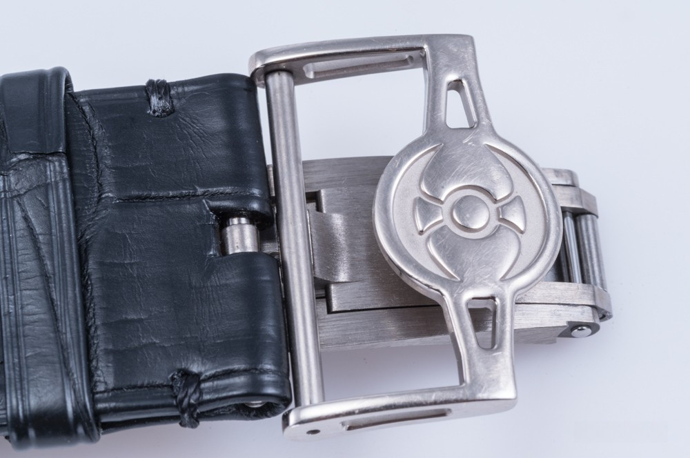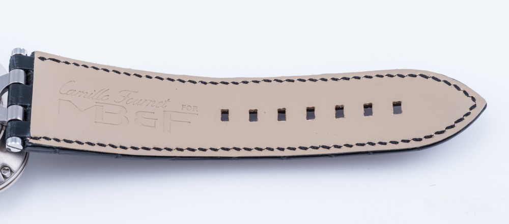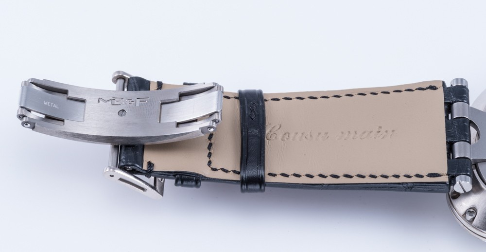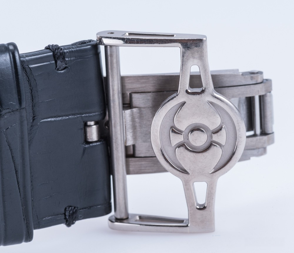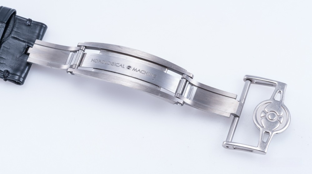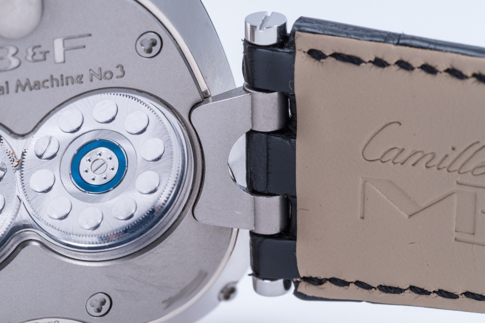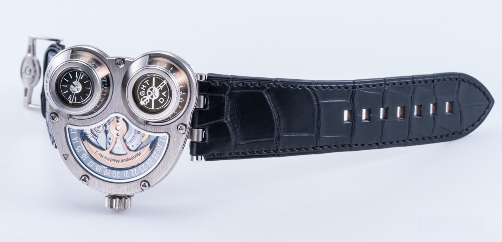 Часы MB&F Horological Machine No.3 представлены в корпусе из белого золота 18к и титана размером 47 x 50 x 16 мм и водонепроницаемостью 30 метров. На серебристом циферблате отображаются часы, минуты, дата, индикатор день/ночь. Внутри корпуса установлен автоматический механизм. Часы поставляются на ремешке из кожи аллигатора с вставкой из титана.