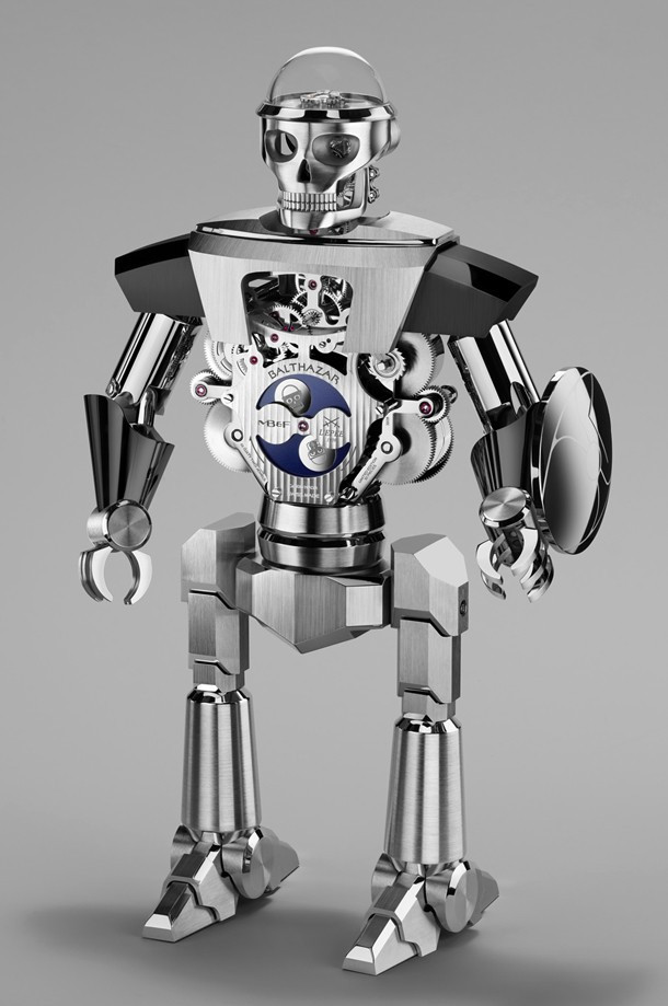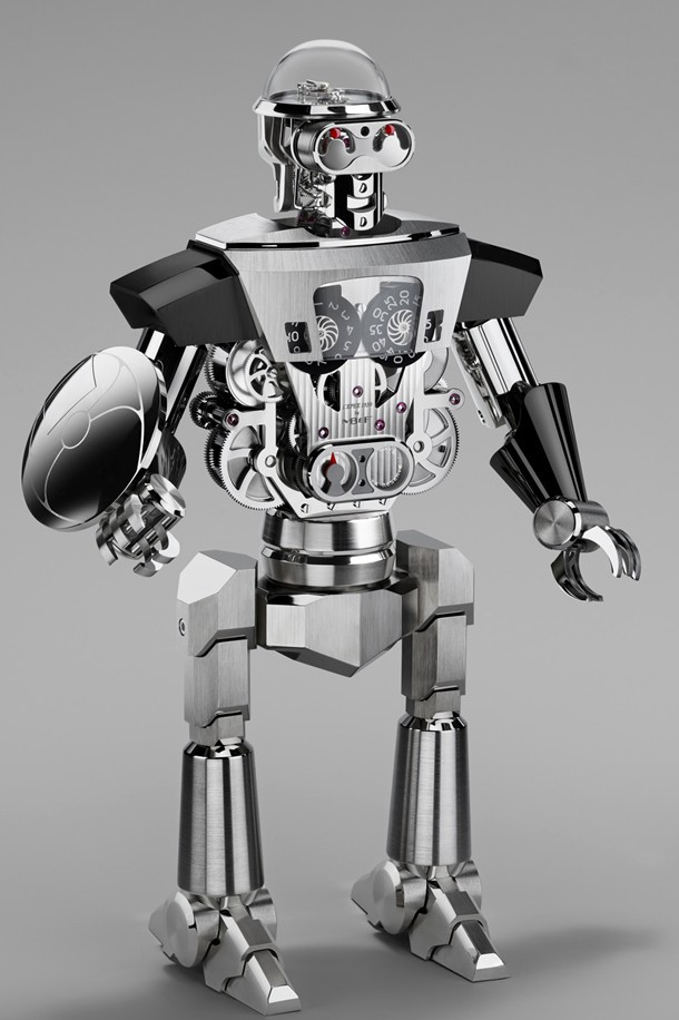 Бальтазар – так называются эти импозантные высокотехнологичные часы-робот с «прыгающей» индикацией часа, ретроградной индикацией секунд и 35-дневным запасом хода. Бальтазар, насчитывающий 618 деталей, выполненных с микроскопической точностью, весит более восьми килограммов, а его высота составляет около 40 см.