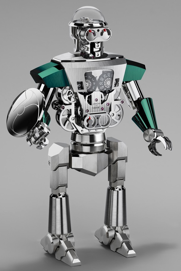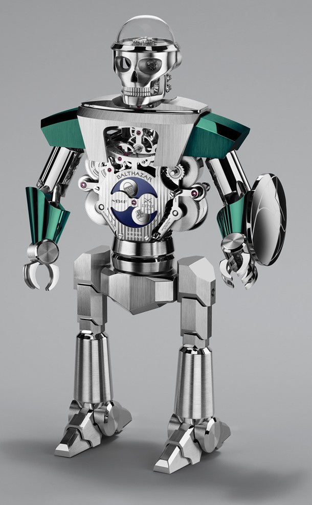 Бальтазар – так называются эти импозантные высокотехнологичные часы-робот с «прыгающей» индикацией часа, ретроградной индикацией секунд и 35-дневным запасом хода. Бальтазар, насчитывающий 618 деталей, выполненных с микроскопической точностью, весит более восьми килограммов, а его высота составляет около 40 см.