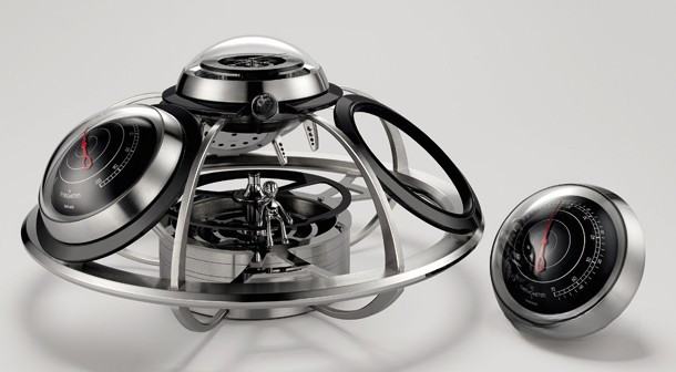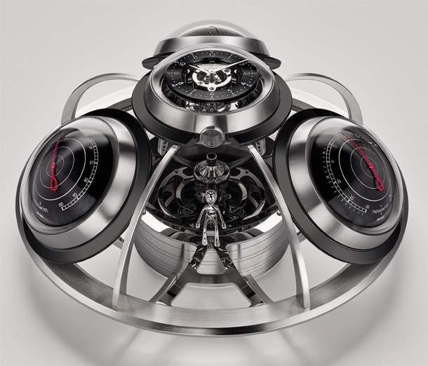 Основатель MB&F Максимилиан Бюссер ознакомился с большим количеством настольных метеостанций прошлого столетия, но не нашел ни одной устраивающей его модели и решил создать свою. «Пятый элемент» образуют четыре съемных и взаимозависимых инструмента-элемента: Элемент часы. Поскольку расчеты прогноза погоды основаны на времени скорости изменений, точный отсчет времени является необходимым условием метеорологических наблюдений. Специально для «Пятого элемента» специалисты компании L’Epée 1839 модифицировали и скелетонизировали свой механизм настольных часов с 8-дневным запасом хода, открыв его конструкцию взгляду. Элемент барометр. Барометр, измеряющий давление воздуха, является базовым инструментом для предсказания погоды: как правило, повышение давления воздуха предвещает ясную погоду, а его понижение сулит ненастье, причем чем быстрее меняется давление, тем ярче будут изменения погоды. Элемент гигрометр. Гигрометр измеряет процентное отношение концентрации водяного пара в воздухе к концентрации насыщенного пара при той же температуре. Элемент термометр. Термометры измеряют не температуру как таковую, а среднюю кинетическую энергию частиц, которые движутся в веществе: чем выше температура, тем выше энергия. Фактически, термометр отображает количество энергии, содержащейся в окружающей нас атмосфере. Несмотря на фантастичный дизайн в космическом стиле, «Пятый элемент» представляет собой самую настоящую метеостанцию. Смелая идея стала реальностью благодаря искусству мастеров L'Epée 1839, которые с высочайшей точностью изготовили эту большую сложную структуру из изогнутых линий и окружностей, вписанных друг в друга. Корабль-база и его съемные элементы насчитывают свыше 500 различных деталей – больше, чем у многих часов с усложнениями. Кроме того, данное устройство имеет дополнительную функцию, которую дизайнеры MB&F как бы ненароком обязательно интегрируют во все свои механические творения: способность вызывать у вас улыбку. В «Пятом элементе» эту роль выполняет Росс. Благодаря отдельному механизму с ручным заводом и пневморегулированием инопланетный пилот совершает круги по кабине НЛО, следя за тем, не появились ли в небе тучи или враждебно настроенные пришельцы.