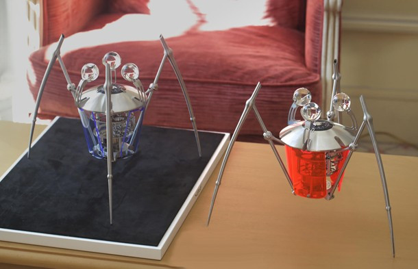 Серия настольных часов TriPod выпускается тремя ограниченными сериями по 50 штук в неоново-синем, неоново-зеленом и неоново-красном цветах. Часы и минуты указаны на двух концентрических циферблатах, видимых с каждой из трех оптических сфер из минерального стекла. Циферблаты совершают один полный оборот за 36 часов. Корпус 30 х 26 см. Вес 2,8 кг. Количество деталей 95. Материалы: латунь с покрытием, оптическое минеральное стекло, люминесцентные акриловые экраны. МеханизмL’Epée 1839, разработанный и изготовленный собственными силами. Балансовая частота: 18 000 полуколебаний в час / 2,5 Гц. Один барабан, запас хода восемь дней. 182 компонента. Камни: 21 (11 в спусковом механизме, 10 в остальном механизме). Система защиты от ударов Incabloc. Ручной завод: двусторонний ключ для установки времени и завода.