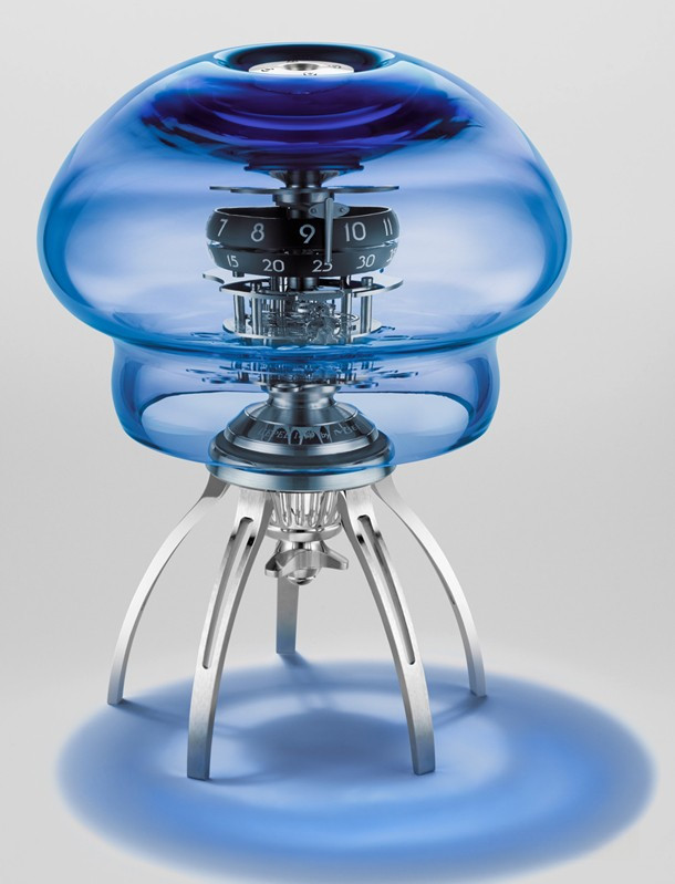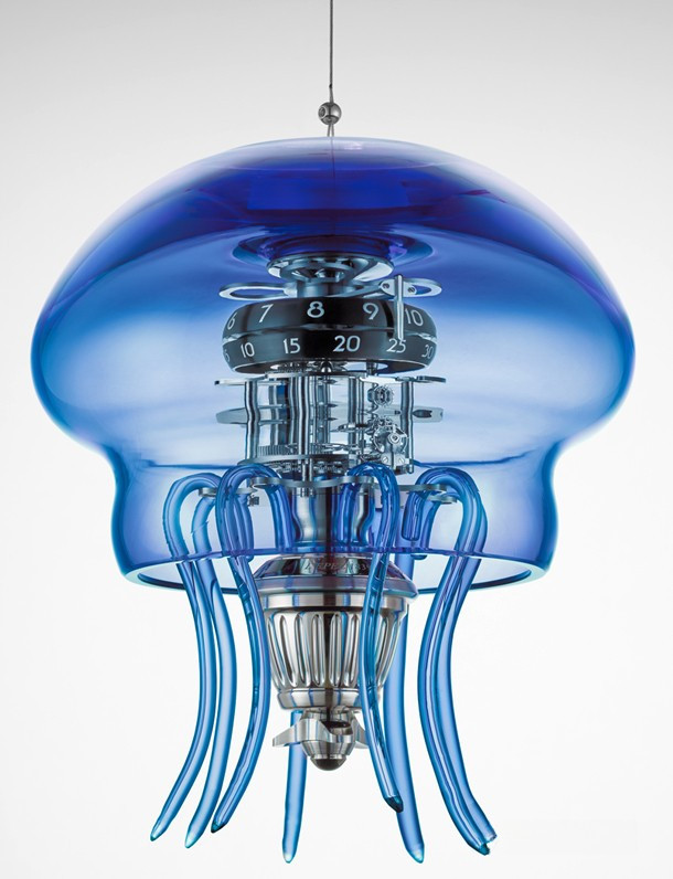 Модель Medusa с куполом и щупальцами из муранского стекла ручной работы выпущена ограниченной серией 50 экземпляров голубого цвета. Индикация: часы и минуты. Размеры в подвешенном положении: высота 286 мм x диаметр 250 мм. В стоячем положении: высота 323 мм x диаметр 250 мм. Вес около 6 кг (в силу ручного исполнения точный вес стеклянного купола может варьироваться). Купол/щупальца: муранское стекло ручной работы. Механизм и опора: латунь и нержавеющая сталь. Индексы и верхняя платина с покрытием Super-LumiNova. Механизм подвесного типа, разработанный и изготовленный в компании L’Epée. Частота баланса 18 000 пк/час. Запас хода 7 дней. Противоударная система Incabloc. Отделка механизма: «Женевские волны», скашивание кромок, полировка, пескоструйная обработка, круговое и вертикальное зернение, сатинирование. Встроенный заводной ключ в форме гребного винта для завода механизма и настройки времени. Скоба в верхней части механизма позволяет подвешивать часы Medusa под потолок. В этом случае к механизму можно прикрепить стеклянные щупальца. Часы Medusa могут быть установлены на столе благодаря специальной металлической опоре.