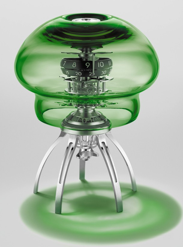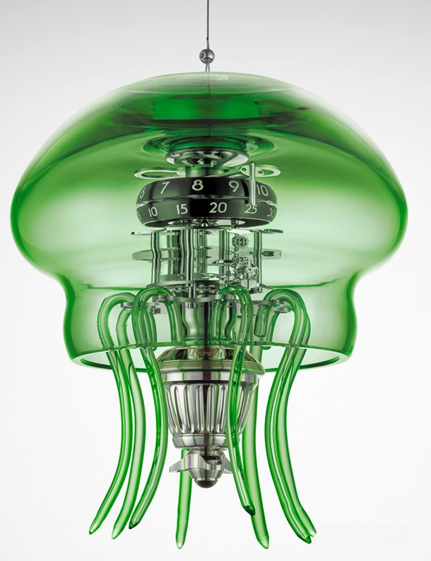 Модель Medusa с куполом и щупальцами из муранского стекла ручной работы выпущена ограниченной серией 50 экземпляров зеленого цвета. Индикация: часы и минуты. Размеры в подвешенном положении: высота 286 мм x диаметр 250 мм. В стоячем положении: высота 323 мм x диаметр 250 мм. Вес около 6 кг (в силу ручного исполнения точный вес стеклянного купола может варьироваться). Купол/щупальца: муранское стекло ручной работы. Механизм и опора: латунь и нержавеющая сталь. Индексы и верхняя платина с покрытием Super-LumiNova. Механизм подвесного типа, разработанный и изготовленный в компании L’Epée. Частота баланса 18 000 пк/час. Запас хода 7 дней. Противоударная система Incabloc. Отделка механизма: «Женевские волны», скашивание кромок, полировка, пескоструйная обработка, круговое и вертикальное зернение, сатинирование. Встроенный заводной ключ в форме гребного винта для завода механизма и настройки времени. Скоба в верхней части механизма позволяет подвешивать часы Medusa под потолок. В этом случае к механизму можно прикрепить стеклянные щупальца. Часы Medusa могут быть установлены на столе благодаря специальной металлической опоре.