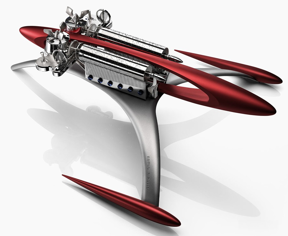 Музыкальная шкатулка MB&F x Reuge MusicMachine 1 Reloaded изготовлена из анодированного алюминия размером 381 x 476 x 140 мм. Вес составляет 3 кг. Серия ограничена - 33 шт.