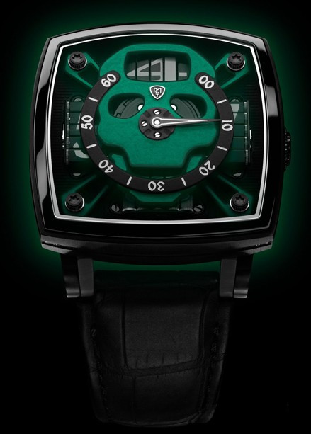 Часы MCT Sequential One S110 Skull представлены в корпусе из титана размером 45 х 45 х 15.5 мм и водонепроницаемостью до 30 метров. Внутри корпуса установлен механизм с ручным заводом с запасом хода 50 часов. На зеленом скелетированном циферблате отображаются часы, минуты. Часы комплектуются ремешком из кожи аллигатора с титановой вставкой. Модель выпущена ограниченной серией 10 шт.