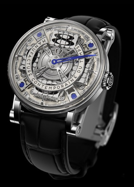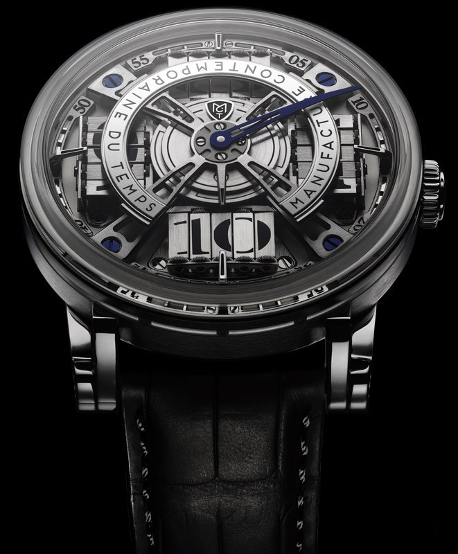 В двух новых ограниченных сериях S210 переосмысленное оформление циферблата придает особую выразительность уникальной структуре механизма MCT-S2.0: блестящая поверхность антрацитового цвета или цвета шампанского подчеркивает высокотехнологичный характер часов. Современная архитектура в очередной раз стала источником вдохновения для специалистов MCT. Две модели, выпущенные ограниченными сериями из 25 экземпляров, пополнили коллекцию Sequential Two. Механизм MCT-S2.0 с автоматическим подзаводом был спроектирован, разработан и собран в стенах компании, в расположенных в Невшателе мастерских. Индикация часов осуществляется с помощью увеличенного размера цифр, которые отображаются четырьмя модулями с пятью трехгранными призмами. Текущий час указывается в окошке выполненного в форме буквы «С» дугообразного индикатора, расположенного в центре циферблата, который одновременно скрывает под собой остальные модули. В момент смены часа индикатор моментально поворачивается на 90° против часовой стрелки для отображения следующего часа. Минутные метки расположены по периметру циферблата. Крупная центральная стрелка гарантирует оптимальную считываемость показаний. Модель Sequential с нестандартным фирменным отображением времени оснащена круглым корпусом диаметром 46,4 мм, изготовленным из титана Grade 5 с DLC-покрытием. Использование сапфирового стекла с антибликовым покрытием в сочетании с выполненным также из сапфирового стекла ободком корпусного кольца позволяет свету проникать внутрь корпуса, что подчеркивает совершенство сложных функций и высокое качество микромеханической обработки.
