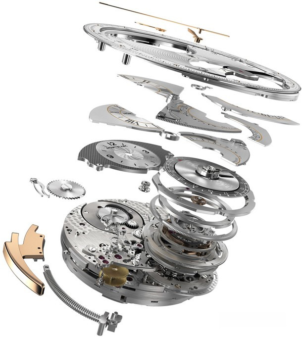 Корпус модели и изогнутые ушки выполнены из розового золота и качественно отполированы, представ в рекордных размерах шириной 52 мм и толщиной 15.8 мм. Всё это включая удвоенную заводную головку на пару с моно-пушером и слегка вогнутым безелем. Благодаря листоподобным стрелкам такие размеры не вызывали бы вопросов даже при более негабаритных форматах. Как и его предшественник, часы является регулятором. Имеется центрированная минутная стрелка, индикатор секунд в центре циферблата и часовой субциферблат в позиции 12 часов. Мануфактурный часовой механизм MB M 67.40 с ручным заводом имеет горизонтальную муфту и колонное колесо. Основная палета выполнена из нейзильбера с родиевым покрытием и круговой зернистостью с обеих сторон. Женевские волны украшают родиевые мосты. Всего часы состоят из 746 компонентов, из которых 494 отвечают за функцию метаморфозы и один – за приводной рычаг классического моста Minerva. Тираж модели Metamorphosis II составляет всего 18 единиц.