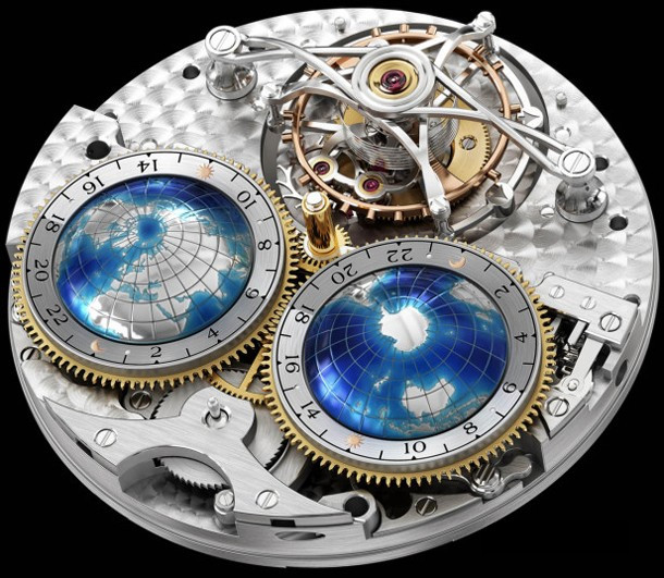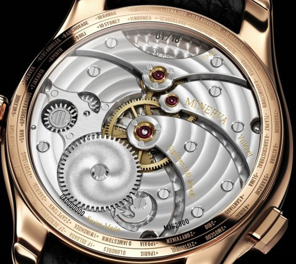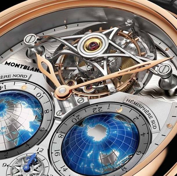 Функционально часы можно классифицировать как ворлдтаймер, они показывают время в любой точке Северного и Южного полушарий, помимо того, с их помощью владелец всегда будет в курсе домашнего и местного времени. А для достижения максимальной точности мастера мануфактуры Minerva, входящей в Montblanc усложнили механизм ворлдтаймера турбийоном. Над циферблатом часов возвышаются две полусферы. Они статичны, но вокруг них вращаются шкалы с часовыми метками и индикаторами дня и ночи. С их помощью можно быстро и максимально наглядно определить время в любой точке земного шара, а также соотнести его со временем нужного часового пояса. Полусферы «расчерчены» линиями, идущими из полюсов, всего их 24, что соответствует количеству часовых зон. Между полушариями размещен небольшой стрелочный индикатор в форме розы ветров, он отвечает за домашнее время. Центральные стрелки показывают местное время.На «12 часах» вращается минутный турбийон с цилиндрической пружиной. Особенность цилиндрической спирали состоит в том, что во время колебаний баланса, ее центр тяжести не смещается и за счет этого она работает точнее обычной плоской спирали. Механизм мануфактурный, он, включая спираль и балансовое колесо, сделан мастерами фабрики Minerva. Механизм заводится вручную. Запас хода составляет 48 часов. Он отделан женевскими волнами и жемчужным зернением. Корпус выполнен из розового золота, его диаметр составляет 47 мм. Серия ограничена 18 экземплярами.