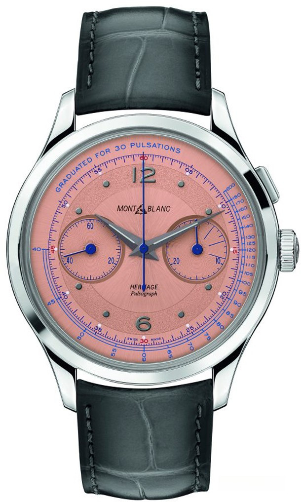 Часы Montblanc Heritage Pulsograph Limited Edition представлены в корпусе из нержавеющей стали размером 40 мм и водонепроницаемостью 50 м. Внутри корпуса установлен механизм с ручным заводом, Калибр MB 13.20, обладающий запасом хода 55 часов. На розовом циферблате отображаются часы, минуты, секунды, накопители хронографа, пульсомер. Часы комплектуются ремешком из кожи аллигатора с вставкой из нержавеющей стали. Серия ограиничена - 100 штук.