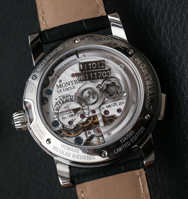 На зерненом циферблате представлены основной эмалевый указатель времени с черной шкалой, часовой и минутной стрелками из розового золота. В темноте, покрытые составом Superluminova арабские цифры, незаметные при дневном свете, появляются на циферблате. Часовая и минутная стрелки также покрыты составом Superluminova. Скелетонизированная часовая стрелка, покрытая родием, отмечает время второго часового пояса. На циферблате также расположились два эмалевых вращающихся диска: 60-секундный счетчик на 8-ми часах и 30-минутный счетчик на 4-х, показания обоих индикаторов считывает неподвижный ромбический двойной индекс из вороненой стали. В завершение образа, на позиции 3-х часов находится апертура даты, а на позиции 9-ти часов – индикатор времени суток второго часового пояса. Сердце часов – автоматический калибр MB R200 с двумя барабанами и 72-часовым запасом хода. Задняя крышка из сапфирового стекла предлагает обзор 319-компонентного механизма, а также индикатора запаса хода. Модель комплектуется черным ремешком из кожи аллигатора и тройной раскладывающейся застежкой.