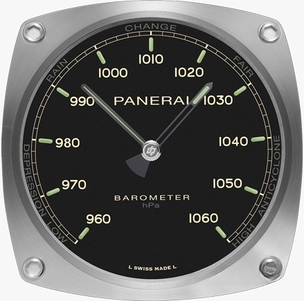 Барометр - прибор разработан итальянским физиком Евангелиста Торричелли в 1643, обеспечивает точные данные об атмосферном давлении. Эта информация используется для прогнозов погоды, высокое атмосферное давление указавает на хорошую погоду, низкое давление предупреждает о плохой погоде. Барометр Panerai содержит металлический ящик, который называется барометрической капсулой, которая сжимается в той или иной степени атмосферного давления. Эта капсула расширяется или сжимается, когда давление атмосферы изменяется и его движения передаются на индикатор прибора.