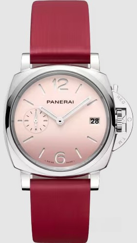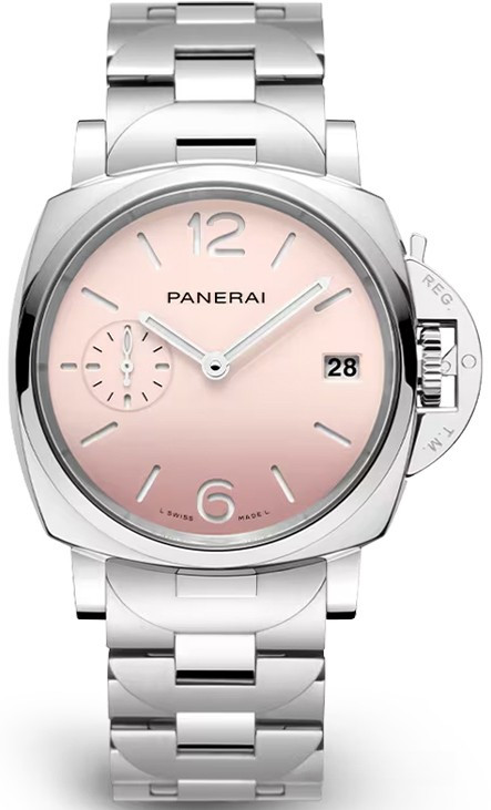 Часы Panerai Luminor Due 3 Days Automatic 38 mm представлены в корпусе из нержавеющей стали диаметром 38 мм водонепроницаемостью 30 метров. Внутри корпуса установлен автоматический механизм, Калибр P.900 с запасом хода 72 часа. На розовом циферблате отображаются часы, минуты, секунды, дата. Часы поставляются на браслете из нержавеющей стали.