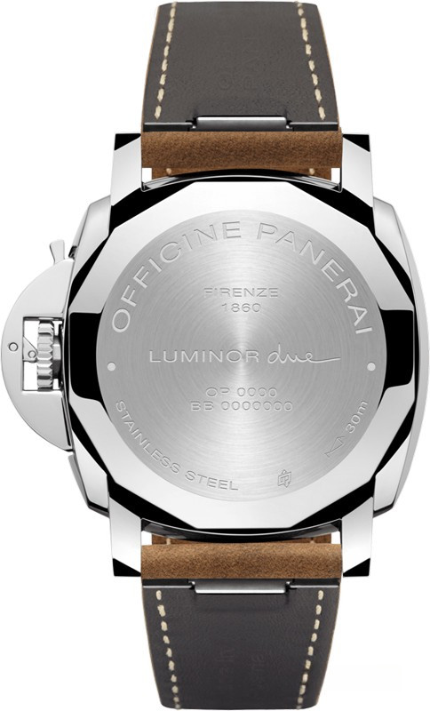 Часы Luminor Due стали самым тонким и универсальным творением Panerai. Их элегантный, гармоничный дизайн с ясными, лаконичными формами является результатом сложной технической переработки исторического дизайна Luminor, превратившей икону среди спортивных часов класса люкс в новую классику, подходящую к любому запястью и для любой ситуации, но при этом сохранившую узнаваемую самобытность Panerai. Корпус Luminor Due насчитывает 42 мм в диаметре и всего лишь 10,5 мм в толщину. Он изготовлен целиком из нержавеющей стали AISI 316L – стального сплава, обладающего антикоррозионными свойствами. Заводная головка защищена классическим мостовым устройством с рычагом, запатентованным Panerai в 1956 году. Корпус и ободок имеют полированную отделку. Стальная задняя крышка имеет глухое исполнение. Антрацитовый циферблат с сатинированной отделкой выдержан в классическом дизайне Panerai с большими светящимися индексами и цифрами. Малая секундная стрелка находится в положении «9 часов», а окошко даты – в положении «3 часа». Ремешок из коричневой кожи прострочен контрастной бежевой нитью. Застежка изготовлена из нержавеющей стали AISI 316L.