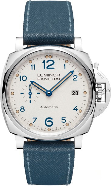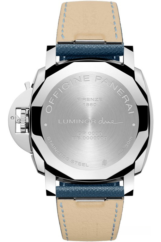 Часы Luminor Due стали самым тонким и универсальным творением Panerai. Их элегантный, гармоничный дизайн с ясными, лаконичными формами является результатом сложной технической переработки исторического дизайна Luminor, превратившей икону среди спортивных часов класса люкс в новую классику, подходящую к любому запястью и для любой ситуации, но при этом сохранившую узнаваемую самобытность Panerai. Корпус Luminor Due насчитывает 42 мм в диаметре и всего лишь 10,5 мм в толщину. Он изготовлен целиком из нержавеющей стали AISI 316L – стального сплава, обладающего антикоррозионными свойствами. Заводная головка защищена классическим мостовым устройством с рычагом, запатентованным Panerai в 1956 году. Корпус и ободок имеют полированную отделку. Стальная задняя крышка имеет глухое исполнение. Белый циферблат с сатинированной отделкой выдержан в классическом дизайне Panerai с большими светящимися индексами и цифрами. Малая секундная стрелка находится в положении «9 часов», а окошко даты – в положении «3 часа». Ремешок из синей кожи прострочен контрастной нитью. Застежка изготовлена из нержавеющей стали AISI 316L.