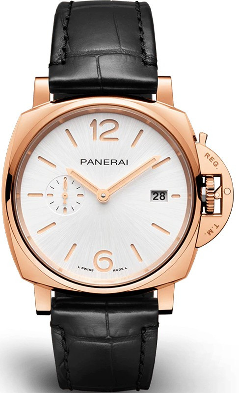 Часы Luminor Due стали самым тонким и универсальным творением Panerai. Их элегантный, гармоничный дизайн с ясными, лаконичными формами является результатом сложной технической переработки исторического дизайна Luminor, превратившей икону среди спортивных часов класса люкс в новую классику, подходящую к любому запястью и для любой ситуации, но при этом сохранившую узнаваемую самобытность Panerai. Корпус Luminor Due насчитывает 42 мм в диаметре и всего лишь 10,5 мм в толщину. Он изготовлен целиком из розового золота 18к. Заводная головка защищена классическим мостовым устройством с рычагом, запатентованным Panerai в 1956 году. Корпус и ободок имеют полированную отделку. Белый циферблат выдержан в классическом дизайне Panerai с большими светящимися индексами и цифрами. Малая секундная стрелка находится в положении «9 часов», а окошко даты – в положении «3 часа». Ремешок из кожи аллигатора с застежкой из розового золота 18к.
