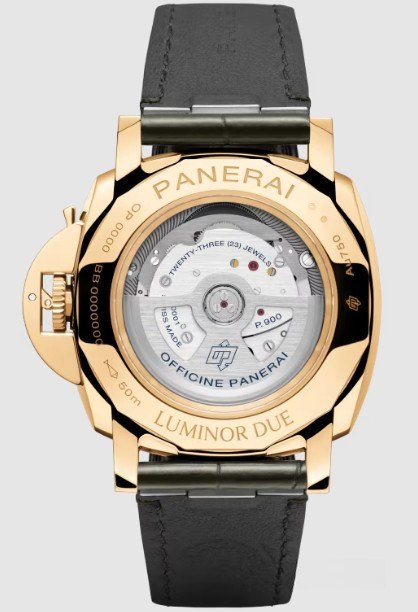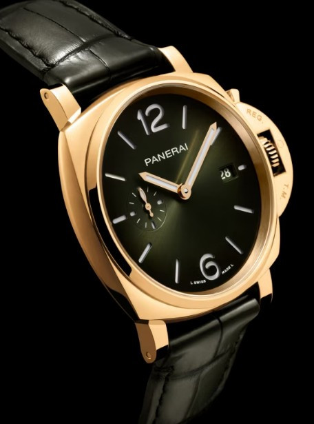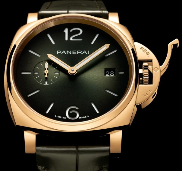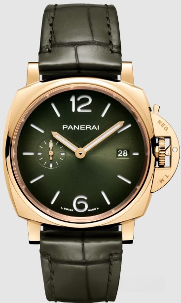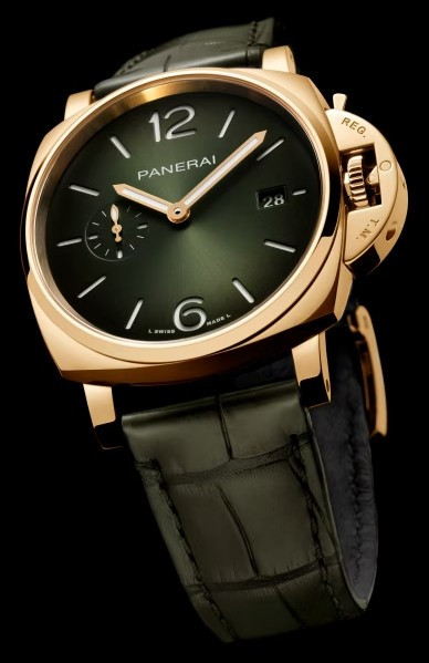 Часы Luminor Due стали самым тонким и универсальным творением Panerai. Их элегантный, гармоничный дизайн с ясными, лаконичными формами является результатом сложной технической переработки исторического дизайна Luminor, превратившей икону среди спортивных часов класса люкс в новую классику, подходящую к любому запястью и для любой ситуации, но при этом сохранившую узнаваемую самобытность Panerai. Корпус Luminor Due насчитывает 42 мм в диаметре и всего лишь 10,5 мм в толщину. Он изготовлен из розового золота 18к. Заводная головка защищена классическим мостовым устройством с рычагом, запатентованным Panerai в 1956 году. Корпус и ободок имеют полированную отделку. Зеленый циферблат выдержан в классическом дизайне Panerai с большими светящимися индексами и цифрами. Малая секундная стрелка находится в положении «9 часов», а окошко даты – в положении «3 часа». Ремешок из кожи аллигатора с застежкой из розового золота 18к.