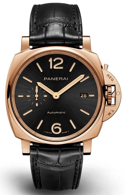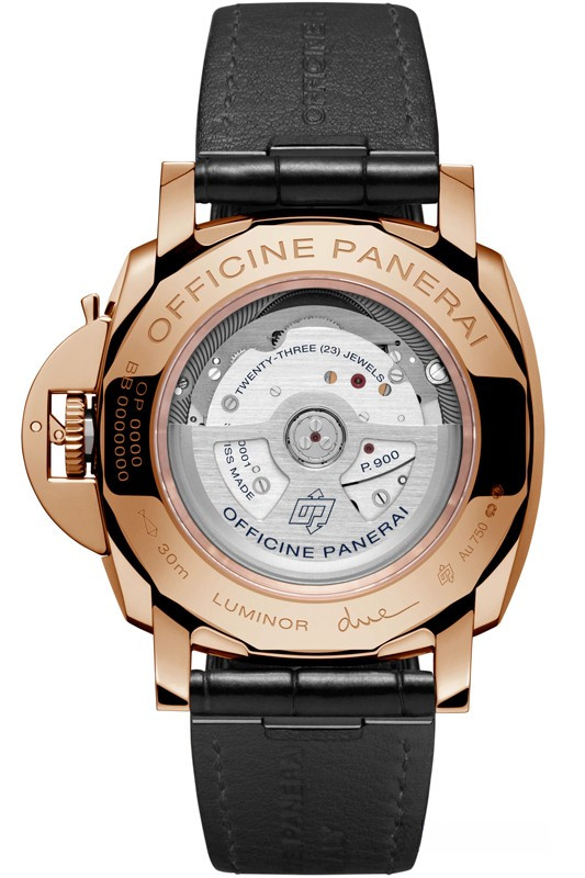 Часы Luminor Due стали самым тонким и универсальным творением Panerai. Их элегантный, гармоничный дизайн с ясными, лаконичными формами является результатом сложной технической переработки исторического дизайна Luminor, превратившей икону среди спортивных часов класса люкс в новую классику, подходящую к любому запястью и для любой ситуации, но при этом сохранившую узнаваемую самобытность Panerai. Корпус Luminor Due насчитывает 42 мм в диаметре и всего лишь 10,5 мм в толщину. Он изготовлен целиком из розового золота 18к. Заводная головка защищена классическим мостовым устройством с рычагом, запатентованным Panerai в 1956 году. Корпус и ободок имеют полированную отделку. Черный циферблат выдержан в классическом дизайне Panerai с большими светящимися индексами и цифрами. Малая секундная стрелка находится в положении «9 часов», а окошко даты – в положении «3 часа». Ремешок из кожи аллигатора. Застежка изготовлена из розового золота 18к.