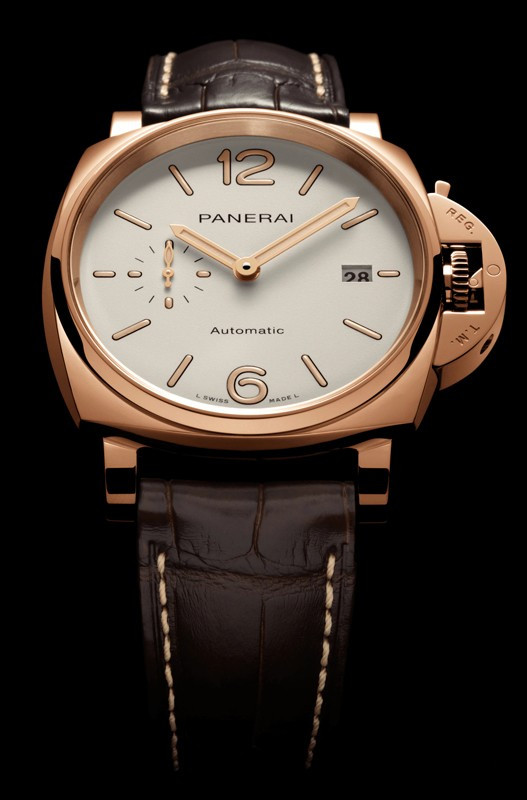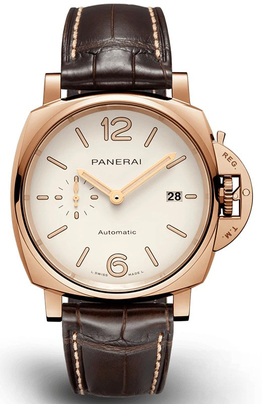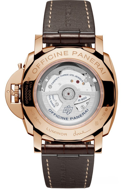 Часы Luminor Due стали самым тонким и универсальным творением Panerai. Их элегантный, гармоничный дизайн с ясными, лаконичными формами является результатом сложной технической переработки исторического дизайна Luminor, превратившей икону среди спортивных часов класса люкс в новую классику, подходящую к любому запястью и для любой ситуации, но при этом сохранившую узнаваемую самобытность Panerai. Корпус Luminor Due насчитывает 42 мм в диаметре и всего лишь 10,5 мм в толщину. Он изготовлен целиком из розового золота 18к. Заводная головка защищена классическим мостовым устройством с рычагом, запатентованным Panerai в 1956 году. Корпус и ободок имеют полированную отделку. Белый циферблат выдержан в классическом дизайне Panerai с большими светящимися индексами и цифрами. Малая секундная стрелка находится в положении «9 часов», а окошко даты – в положении «3 часа». Ремешок из кожи аллигатора. Застежка изготовлена из розового золота 18к.