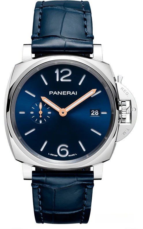 Часы Luminor Due стали самым тонким и универсальным творением Panerai. Их элегантный, гармоничный дизайн с ясными, лаконичными формами является результатом сложной технической переработки исторического дизайна Luminor, превратившей икону среди спортивных часов класса люкс в новую классику, подходящую к любому запястью и для любой ситуации, но при этом сохранившую узнаваемую самобытность Panerai. Корпус Luminor Due насчитывает 42 мм в диаметре и всего лишь 10,5 мм в толщину. Он изготовлен целиком из нержавеющей стали. Заводная головка защищена классическим мостовым устройством с рычагом, запатентованным Panerai в 1956 году. Корпус и ободок имеют полированную отделку. Синий циферблат выдержан в классическом дизайне Panerai с большими светящимися индексами и цифрами. Малая секундная стрелка находится в положении «9 часов», а окошко даты – в положении «3 часа». Ремешок из кожи аллигатора. Застежка изготовлена из нержавеющей стали.
