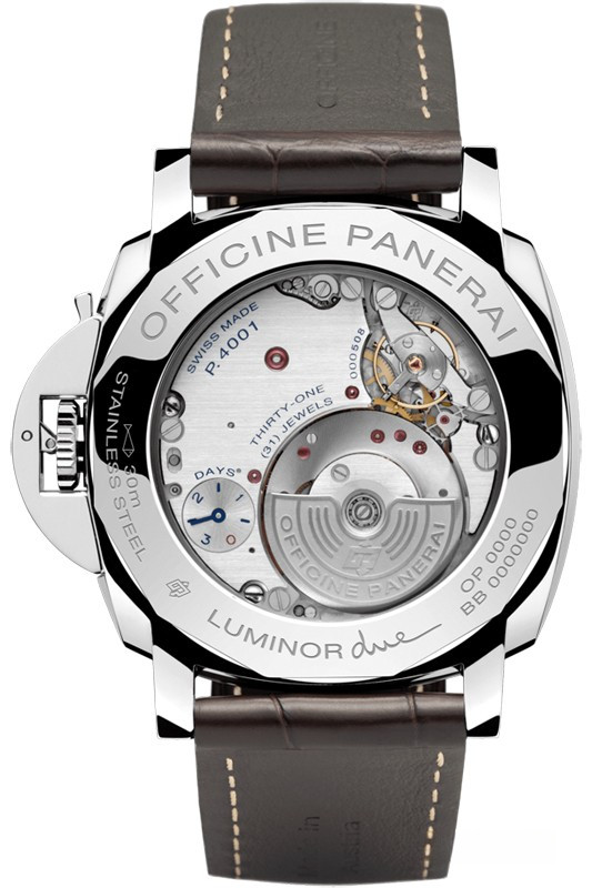 Технически сложные часы Luminor Due 3 Days Automatic (PAM 00943), выдержанные в простом и лаконичном дизайне, представляют собой синтез исторических корней и современных достижений. Модель, созданная на Мануфактуре Panerai в Невшателе, имеет корпус Luminor диаметром 45 мм, антрацитовый циферблат и самый современный автоматический калибр P.4001. У этой модели корпус Luminor Due изготовлен из нержавеющей стали AISI 316L. При толщине всего несколько миллиметров он транслирует увлекательную историю часов Panerai посредством лаконичных форм и характерного мостового устройства для защиты заводной головки. У часов Luminor Due 3 Days Automatic (PAM 00943) имеется круглый индикатор запаса хода, который расположен с задней стороны. Любоваться часовым механизмом позволяет сапфировое стекло задней крышки. Часы Luminor Due комплектуются ремешком из коричневой кожи аллигатора с контрастной бежевой прострочкой и сохраняют водонепроницаемость до 3 бар (до глубины около 30 метров).