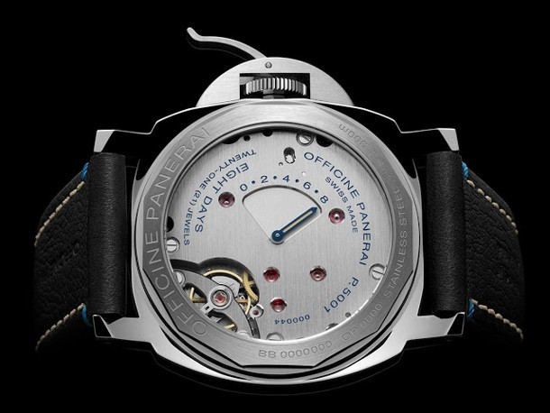 Модель Luminor Left-Handed 8 Days Acciaio PAM00796 имеет стальной корпус с черным сэндвич-циферблатом и ремешок того же цвета. Коронка и ее защитное устройство расположены на 9-ти часах. Это решение предназначено для левшей и для тех, кто предпочитает носить часы на правой руке. Часы комплектуются механизмом с ручным заводом, Калибр P.5001, обладающим 8-дневным запасом хода. Индикатор запаса хода находится с обратной стороны корпуса под сапфировым стеклом.