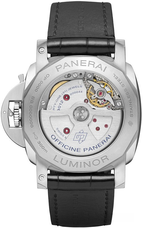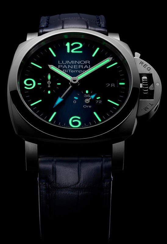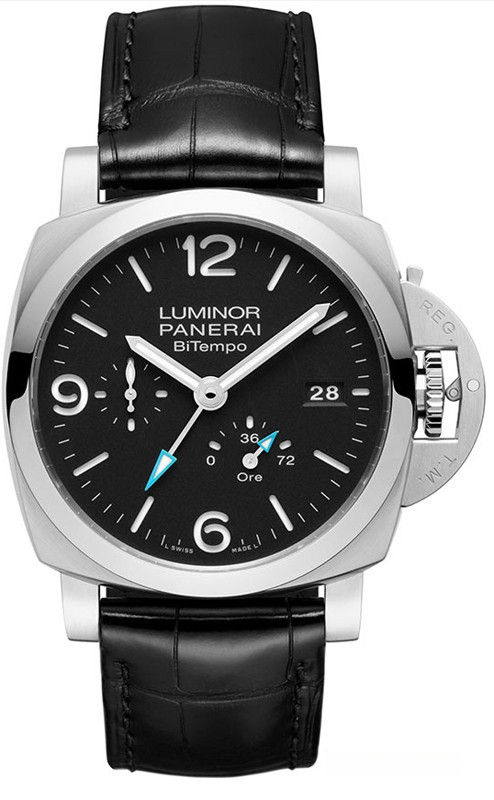 Часы Officine Panerai Luminor BiTempo представлены в корпусе из нержавеющей стали размером 44 мм водонепроницаемостью 300 метров. Внутри корпуса установлен автоматический механизм, Калибр P.9012, обладающий запасом хода 72 часа. На черном циферблате отображаются часы, минуты, секунды, дата, запас хода. Часы поставляются на реешке из кожи аллигатора с застежкой из нержавеющей стали.