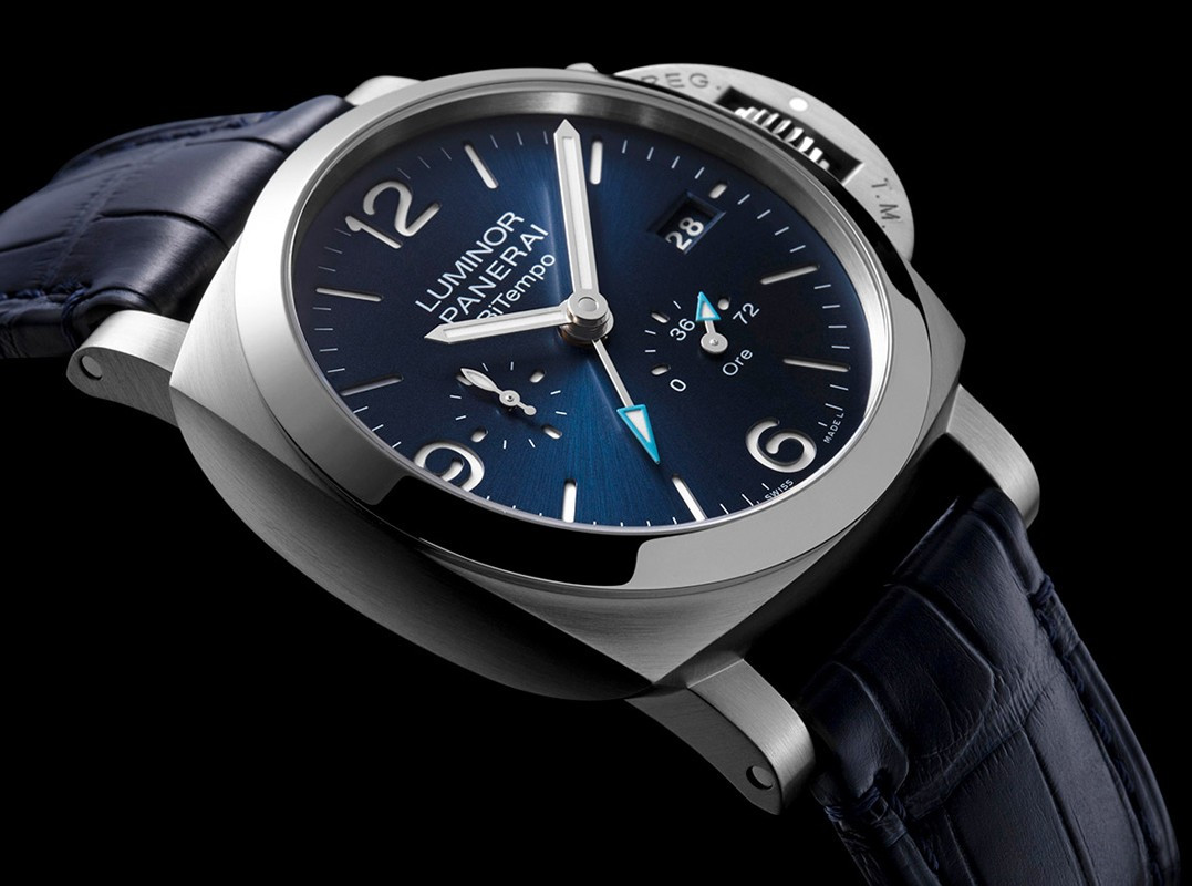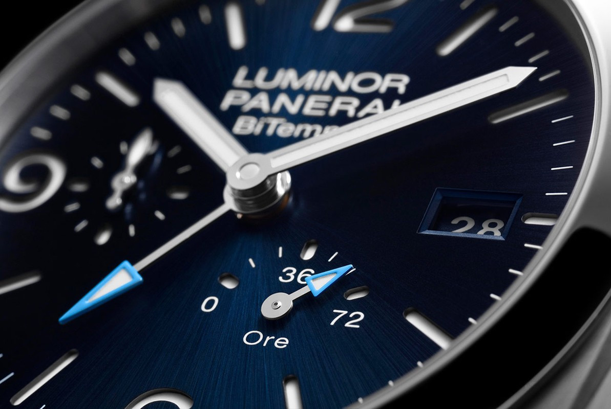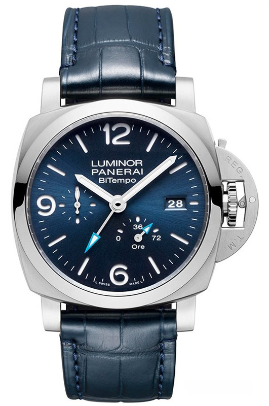 Часы Officine Panerai Luminor BiTempo представлены в корпусе из нержавеющей стали размером 44 мм водонепроницаемостью 300 метров. Внутри корпуса установлен автоматический механизм, Калибр P.9012, обладающий запасом хода 72 часа. На синем циферблате отображаются часы, минуты, секунды, дата, запас хода. Часы поставляются на реешке из кожи аллигатора с застежкой из нержавеющей стали.