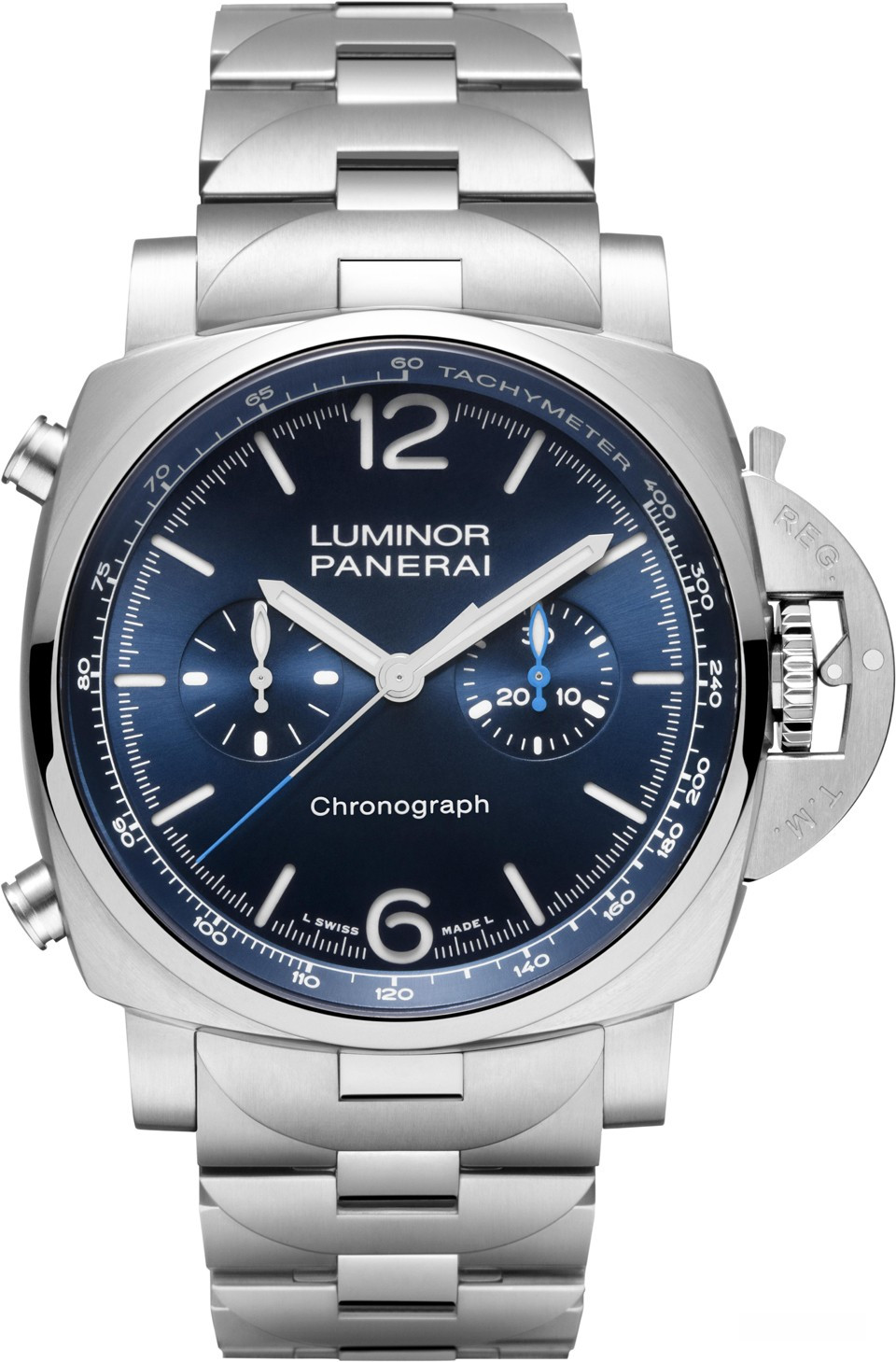 Часы Officine Panerai Luminor Chrono представлены в корпусе из нержавеющей стали размером 44 х 15.65 мм водонепроницаемостью 100 метров. Внутри корпуса находится автоматический механизм, Калибр P.9200, обладающий запасом хода 42 часа. На синем циферблате отображаются часы, минуты, секунды, тахиметр. Часы поставляются на браслете из нержавеющей стали.