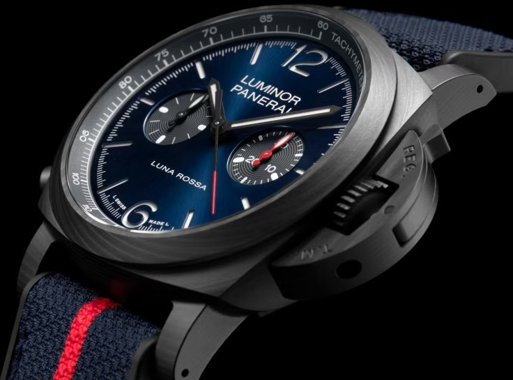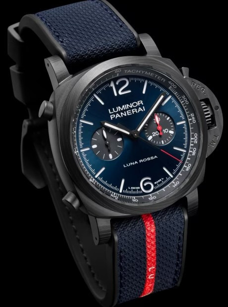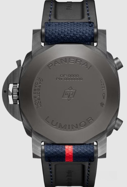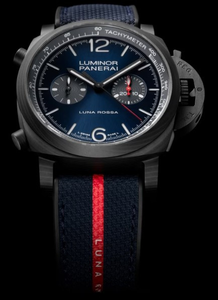 Часы Officine Panerai Luminor Chrono представлены в корпусе из Carbotech размером 44 х 15.65 мм водонепроницаемостью 100 метров. Внутри корпуса находится автоматический механизм, Калибр P.9200, обладающий запасом хода 42 часа. На синем циферблате отображаются часы, минуты, секунды, тахиметр. Часы поставляются на текстильном ремешке с застежкой из нержавеющей стали.