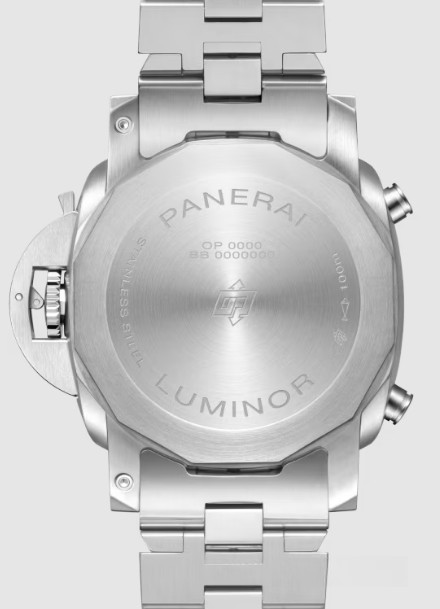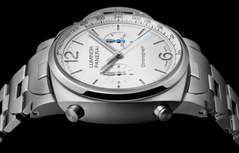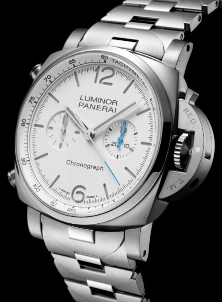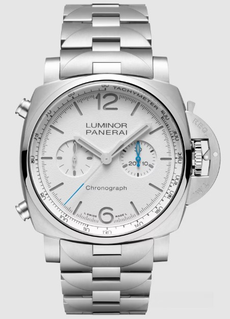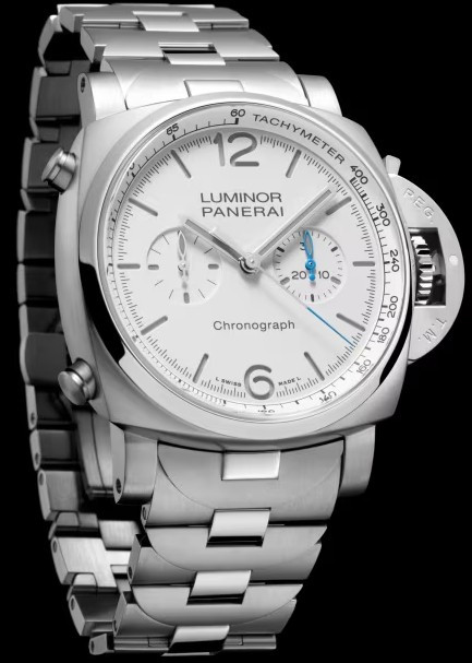 Часы Officine Panerai Luminor Chrono представлены в корпусе из нержавеющей стали размером 44 х 15.65 мм водонепроницаемостью 100 метров. Внутри корпуса находится автоматический механизм, Калибр P.9200, обладающий запасом хода 42 часа. На белом циферблате отображаются часы, минуты, секунды, тахиметр. Часы поставляются на браслете из нержавеющей стали.