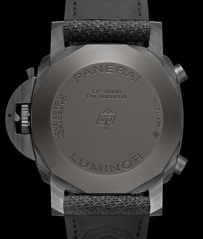 Часы Officine Panerai Luminor Chrono Carbotech представлены в корпусе размером 44 мм из карбона водонепроницаемостью 100 метров. Внутри корпуса установлен автоматический механизм, Калибр P.9200, обладающий запасом хода 42 часа. На черном циферблате отображаются часы, минуты, секунды, накопители хронографа. Часы поставляются на текстильном ремешке с титановой затежкой.