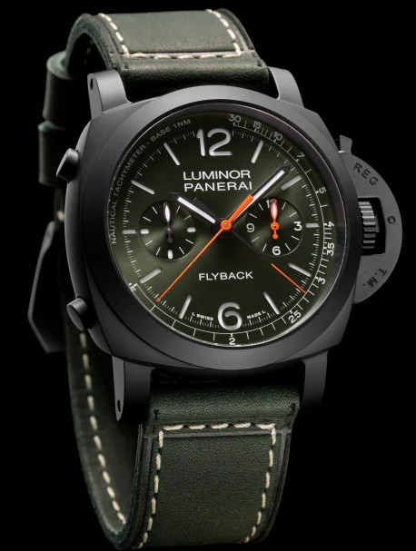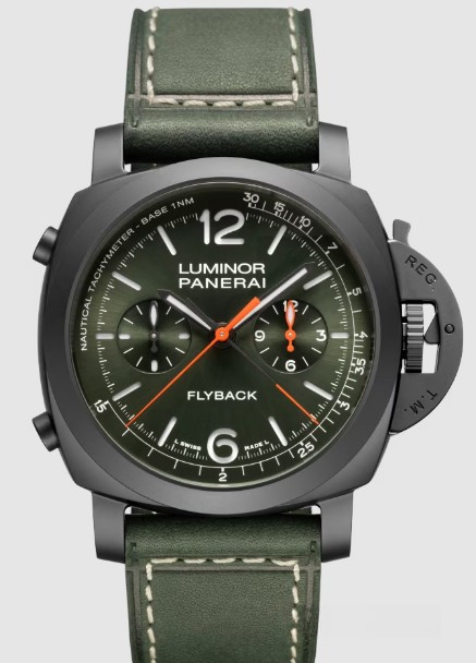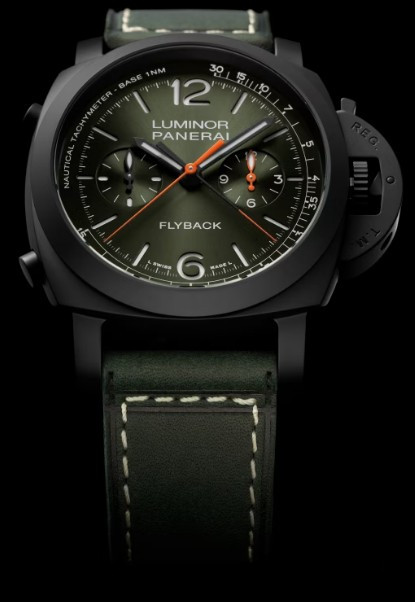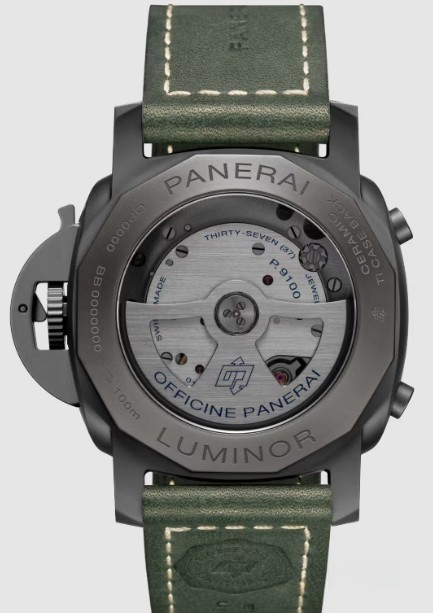 Часы Officine Panerai Luminor Chrono Flyback представлены в корпусе из керамики размером 44 мм водонепроницаемостью 100 метров. Внутри корпуса находится автоматический механизм, Калибр P.9100, обладающий запасом хода 3 дня. На зеленом циферблате отображаются часы, минуты, секунды, тахиметр, хронограф. Часы поставляются на кожаном ремешке с застежкой из нержавеющей стали.