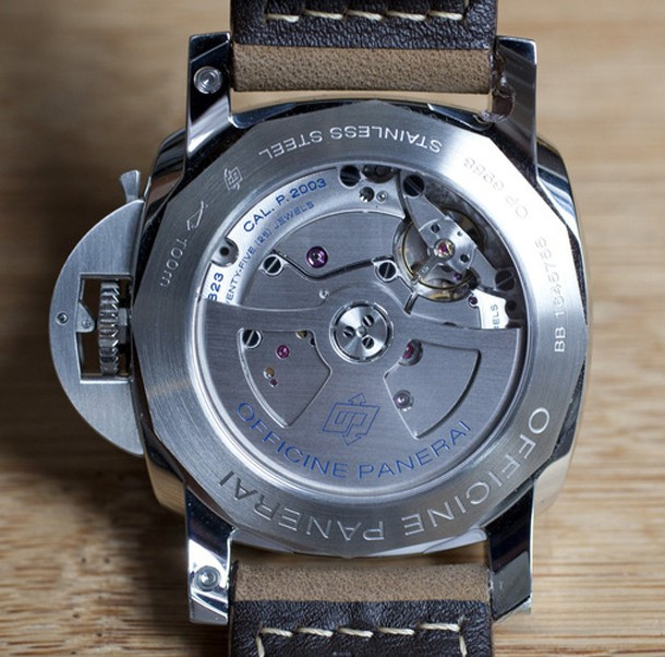 Модель PAM 533, по большому счету, обладает таким же разборчивым и чистым циферблатом, как часы Panerai с функцией исчисления времени, но с добавлением второго часового пояса и индикатора запаса хода. Этот индикатор линейный и установлен чуть выше метки «6 часов», демонстрируя длительный 10-дневный запас хода. Ненавязчивое окошко даты и дополнительная часовая стрелка для отображения функций GMT имеет люминесцентное покрытие для удобства чтения в темноте. Модель PAM 533 также имеет две другие утонченные особенности, которые добавляют данным часам функциональности. Первая из них представляет собой возможность регулировать заводной головкой часовую стрелку «прыгающим шагом» в один час при установке нового часового пояса, сохраняя значение домашнего времени. Второй особенностью является индикатор am/pm (до полудня / после полудня), секундный и 24-часовой индикатор в позиции «9 часов». PAM 533 имеет Калибр P.2003, первый полностью мануфактурный автоматический механизм с новой мануфактуры Panerai в Невшателе. 10 дней запаса хода (240 часов) сохраняется при промощи трех баррелей, что представляет собой нечто необычное для автоматических часов. Сам Калибр в толщину составляет 8 мм и имеет 296 деталей, 25 из которых камни.