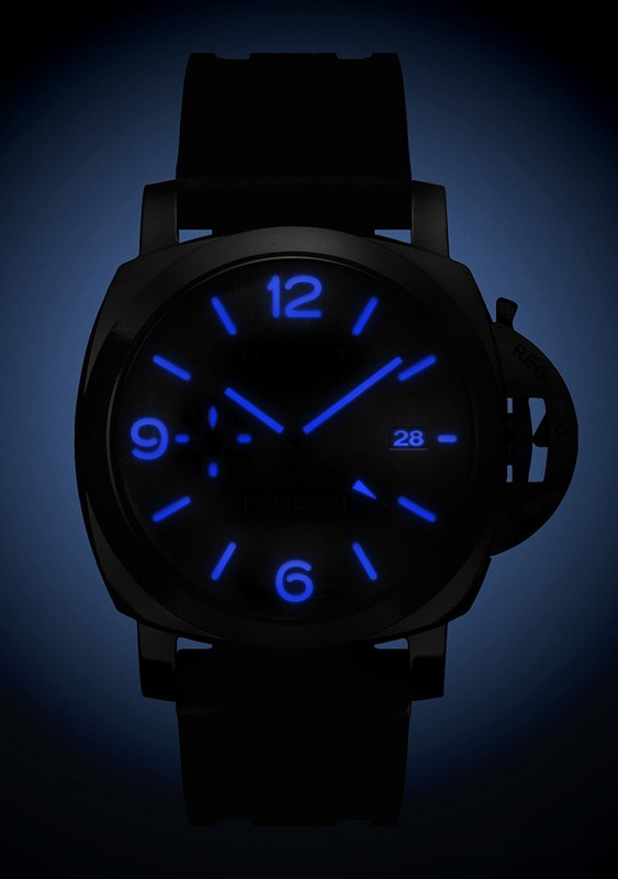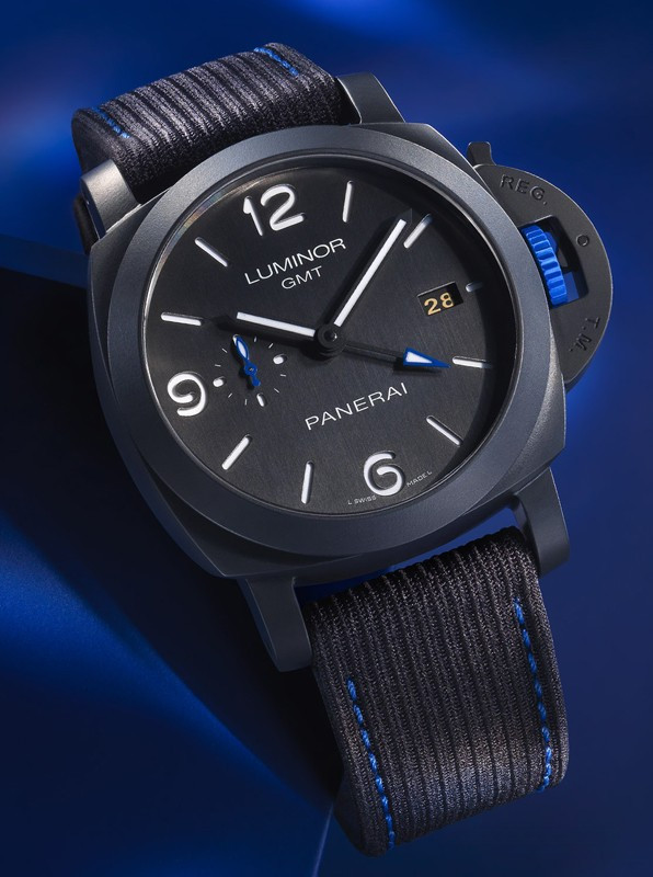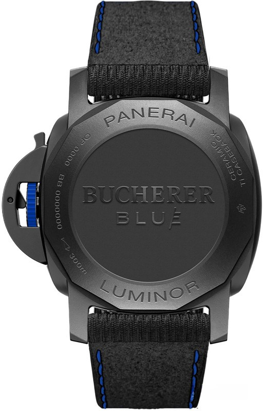 Часы Officine Panerai Luminor GMT Bucherer Blue представлены в корпусе из керамики диаметром 44 мм водонепроницаемостью 300 метров. Внутри корпуса установлен автоматический механизм, Калибр P.9010, обладающий запасом хода 3 дня. На черном циферблате отображаются часы, минуты, секунды, дата, GMT. Часы поставляются на каучуковом ремешке с титановой вставкой. Часы выпущены ограниченной серией 288 экземпляров.