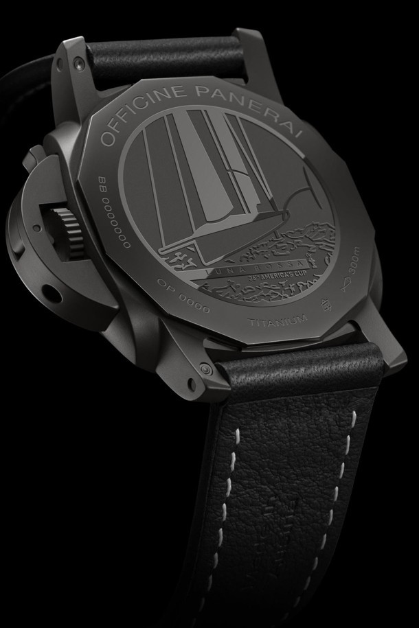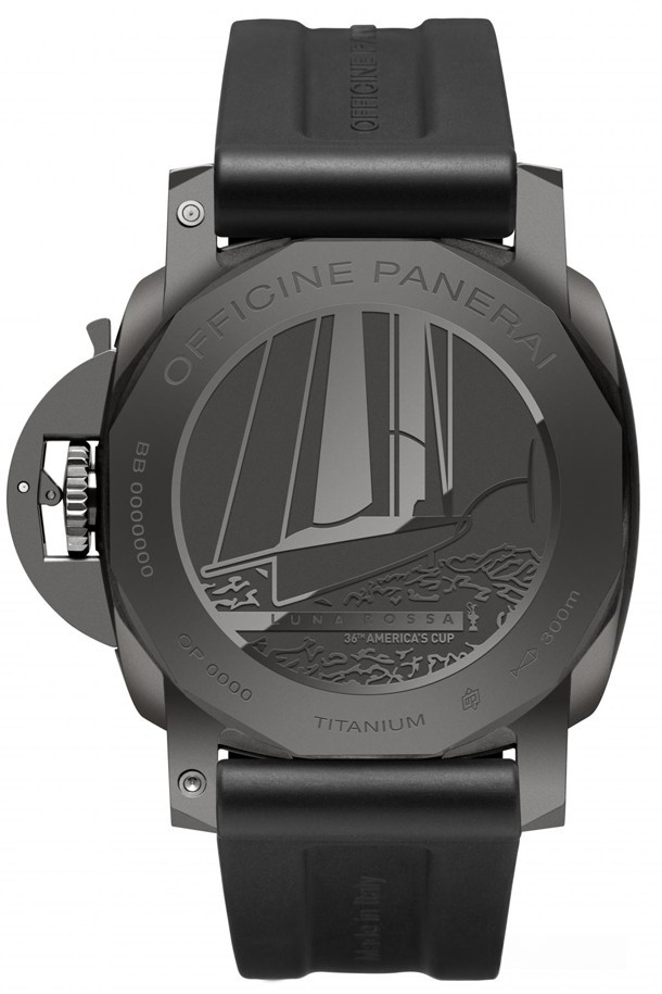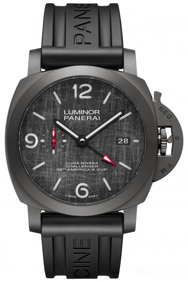 Часы Panerai Luminor Luna Rossa представлены в корпусе из титана с покрытием DLC размером 44 х 15.65 мм водонепроницаемостью 300 метров. Внутри корпуса находится автоматический механизм, Калибр P.9010/GMT, обладающий запасом хода 3 дня. На сером циферблате отображаются часы, минуты, секунды, дата. Часы поставляются на каучуковом ремешке с титановой вставкой.