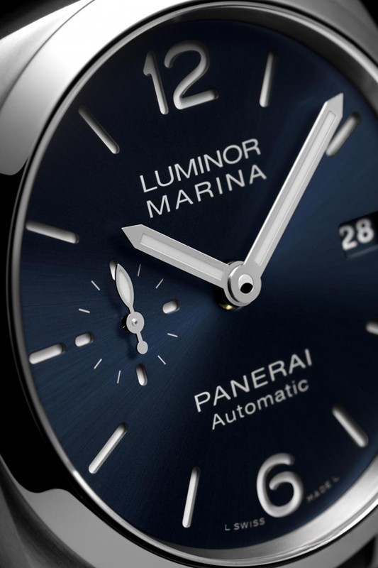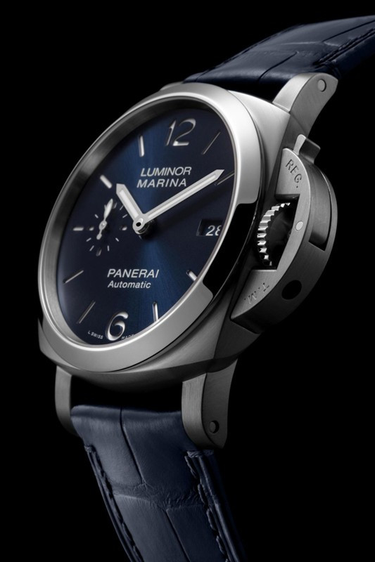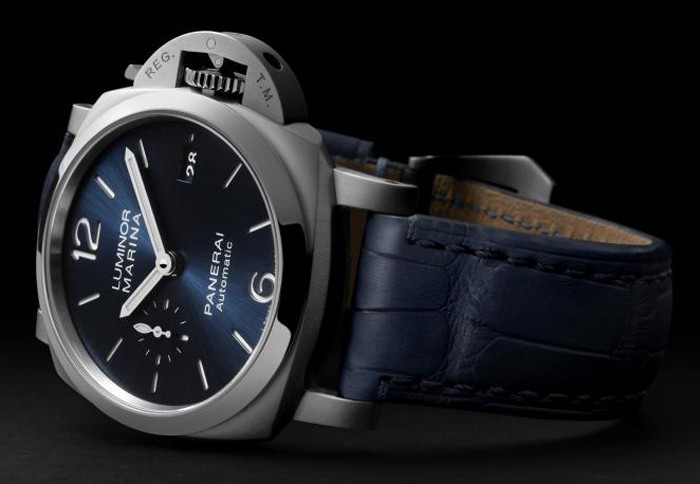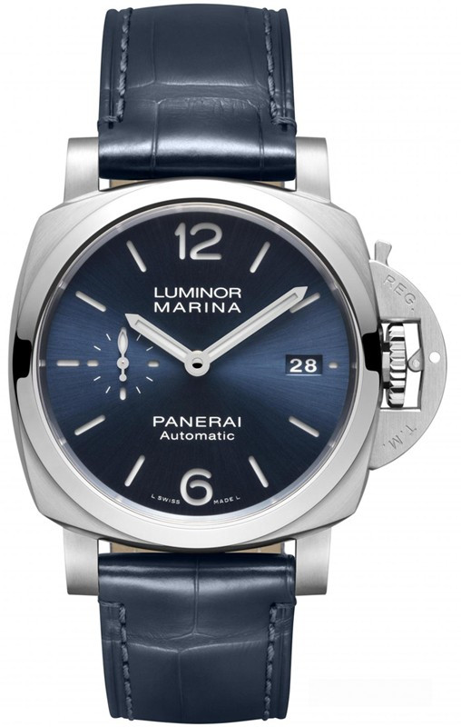 Часы Officine Panerai Luminor Marina 42 mm представлены в корпусе из нержавеющей стали размером 42 мм, водонепроницаемость до 100 метров. Внутри корпуса установлен автоматический механизм, Калибр P.9010 с запасом хода 3 дня. На синем циферблате отображаются часы, минуты, секунды, дата. Часы комплектуются ремешком из кожи аллигатора с вставкой из нержавеющей стали.
