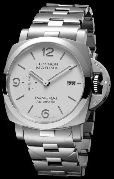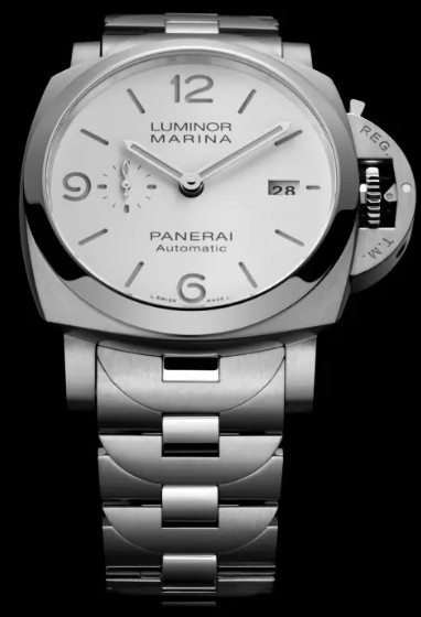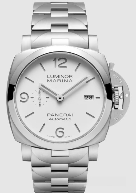Часы Officine Panerai Luminor Marina 44 mm представлены в корпусе из нержавеющей стали размером 44 х 15.65 мм, водонепроницаемость до 300 метров. Внутри корпуса установлен автоматический механизм, Калибр P.9010 с запасом хода 3 дня. На белом циферблате отображаются часы, минуты, секунды, дата. Часы комплектуются браслетом из нержавеющей стали.