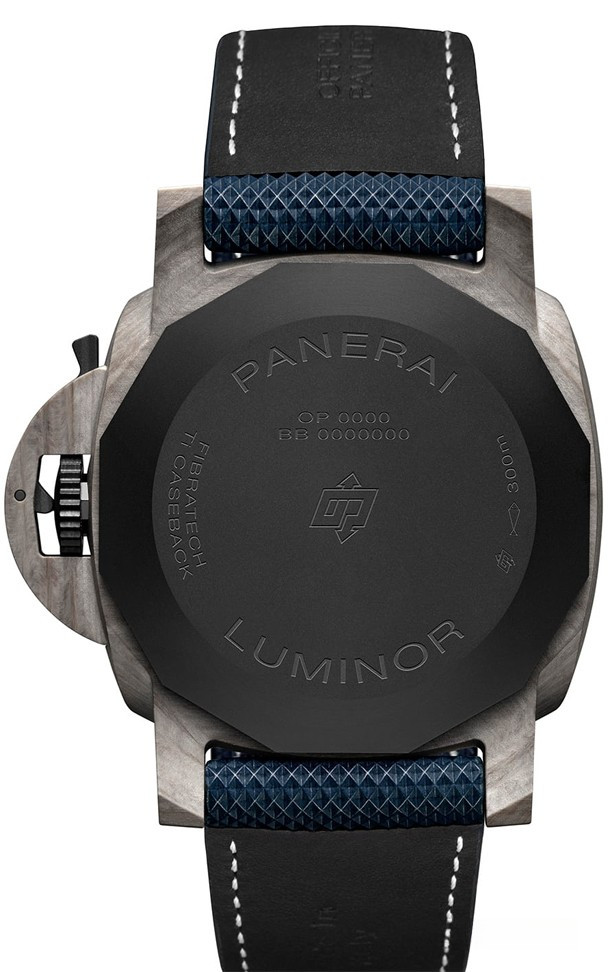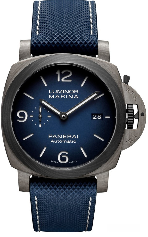 Часы Officine Panerai Luminor Marina 44 mm представлены в корпусе из Fibratech размером 44 х 15.65 мм, водонепроницаемость до 300 метров. Внутри корпуса установлен автоматический механизм, Калибр P.9010 с запасом хода 3 дня. На синем циферблате отображаются часы, минуты, секунды, дата. Часы комплектуются текстильным ремешком с титановой вставкой.
